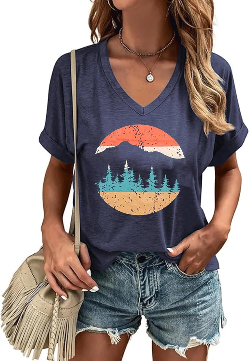 Women V Neck Graphic Shirts Summer Loose Fit Short Sleeve Tops Boho T-Shirt