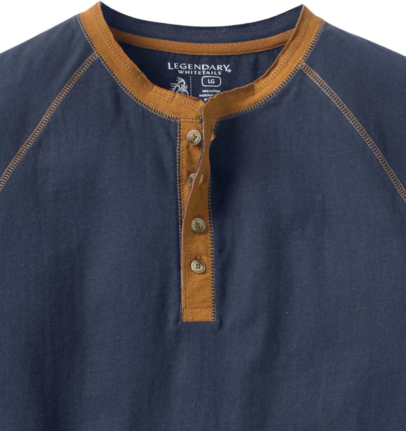 We promised you great everyday apparel for outdoor enthusiasts and hunters, this piece is no exception. Distressed seams give this men’s Henley long sleeve shirt a rugged look, while sueded cotton gives it a soft feel. It’s a perfect fit for your outdoor lifestyle, with easy-moving raglan long sleeves and a 4-button placket for easy on/off. Contrast stitching, Legendary label at hem. Big & Tall sizes are designed for men over 6’2″ and add 2″ in body length and 1-1⁄2″ in sleeve length.Size Instructions: