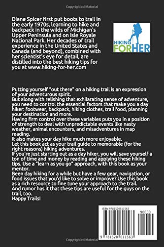 Putting yourself “out there” on a hiking trail is an expression of your adventurous spirit. But along with relishing that exhilarating sense of adventure, you need to control the essential factors that make you a day hiker: footwear, backpack, hiking clothes, trail food, planning your destination and more.Having firm control over these variables puts you in a position of strength to deal with unpredictable events like nasty weather, animal encounters, and misadventures in map reading.It also makes your day hike much more enjoyable.Yearning to turn the idea of taking a hike into reality? You need these tips from a seasoned hiker to get you onto a trail in comfort and safety. Already dayhiking? These “best of” hiking tips from Hiking For Her will open your eyes to new ways of thinking about gear, hiking clothes, hydration, energy, pacing and more. Each of the ten chapters give you detailed, specific advice to apply before, during and after your day hike. Learn how to buy the best gear, why safety items are essential, which foods and beverages to pack, how to choose the ideal destination and how to get there (and back) safely.Female hikers need tips about how to handle body fluids and wastes while hiking. Trail stresses are also covered: losing the trail, animal encounters, stranger dangers, just to name a few.And once you’re off the trail, try the plentiful tips for dealing with soreness, inflammation and lack of motivation to make you ready and eager to hit the trail next time.This book acts as two hiking advice books in one: the best hiking tips for day hikers rolled into one organized streamlined experience, plus bonus materials and surprises to explore at your leisure.Let this book act as your trail guide to memorable (for the right reasons) hiking adventures.If you’re just starting out as a day hiker, you will save yourself a ton of time and money by reading and applying these hiking tips. Use a “learn as you go” approach, with this book as your mentor.Been day hiking for a while but have a few gear, navigation, or food issues that you’d like to solve or improve? Use this book as a rich resource to fine tune your approach to the trail.And rumor has it that these tips are useful for the guys on the trail, too.Hiking For Her’s mission is to get women on trails for safe, enjoyable hiking adventures. Won’t you join us?