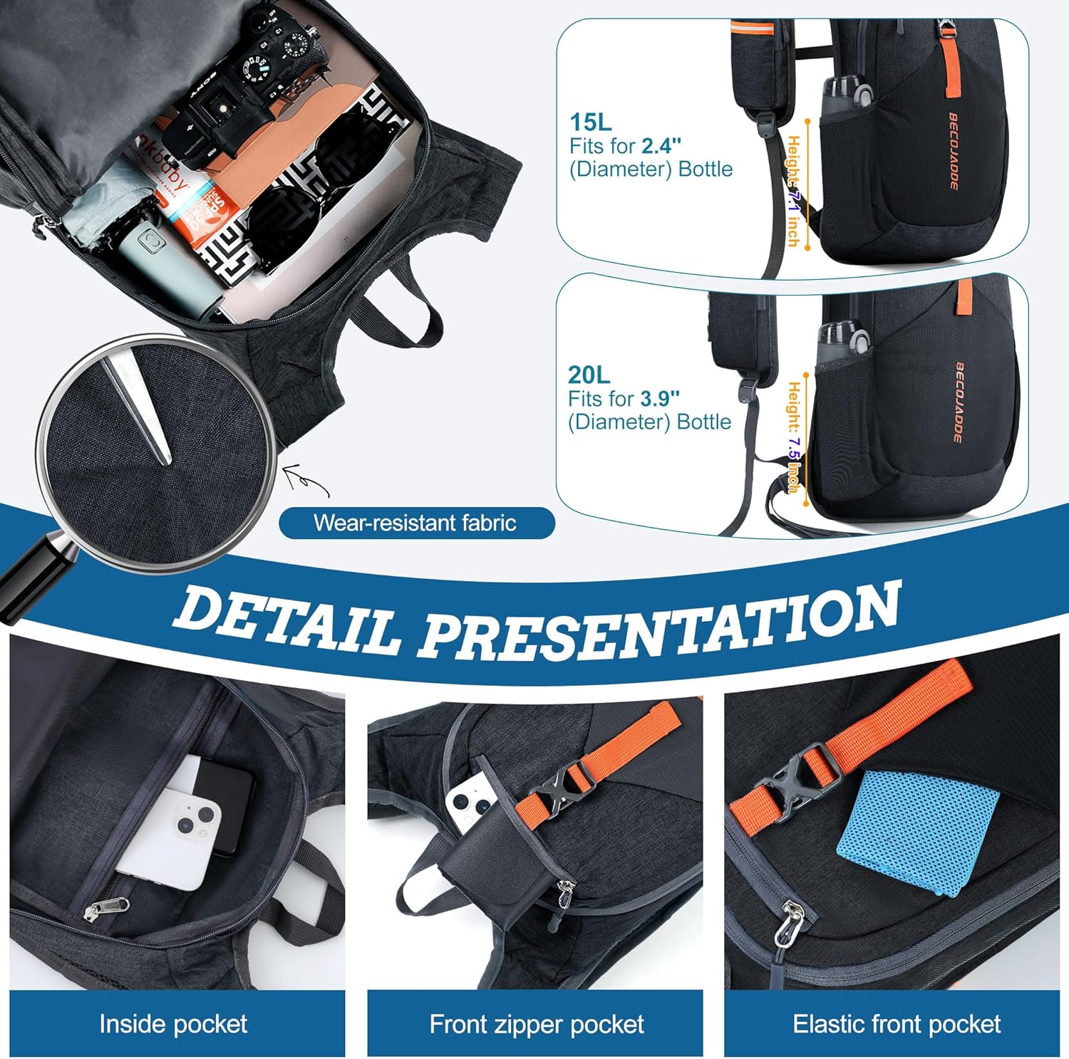 Organized Multi-Pocket Design: With a capacity of 15L, this lightweight backpack for travel features several compartments, including a front elastic mesh pocket, a front zippered pocket, 2 water bottle holder, and a rear anti-theft zippered pocket, keeping your essentials organized and accessible.