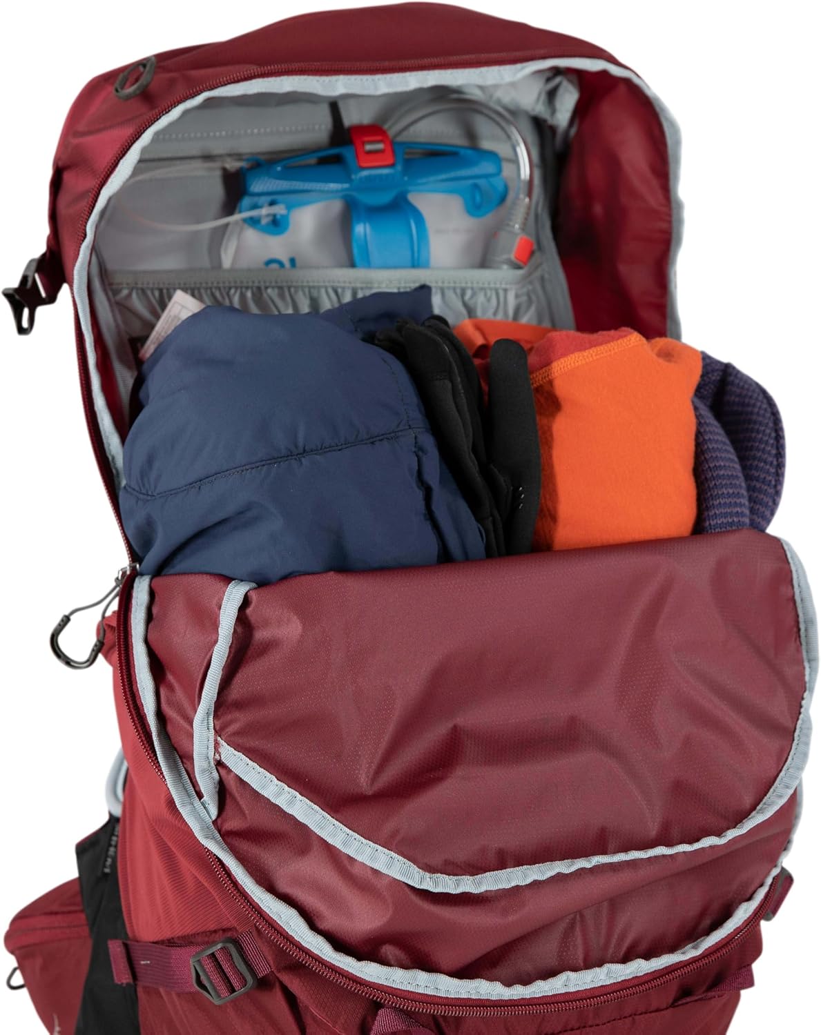 SMART STORAGE & ORGANIZATION: An internal reservoir sleeve with hose port and Osprey Hydraclip for easily hanging a reservoir, extra tall side pockets for your water bottle, padded hipbelt with dual pockets, front mesh shove-it pocket, dual trekking pole loops, and compression straps easily manage day hiking essentials.