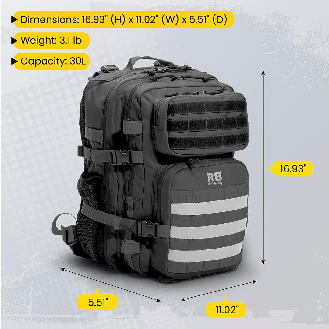Tactical Carry-On Backpack — This 30L tactical backpack fits most airline sizers (43×28×14 cm). Compression straps keep the profile slim for flights and daily commute; rear pass-through secures to your suitcase handle.