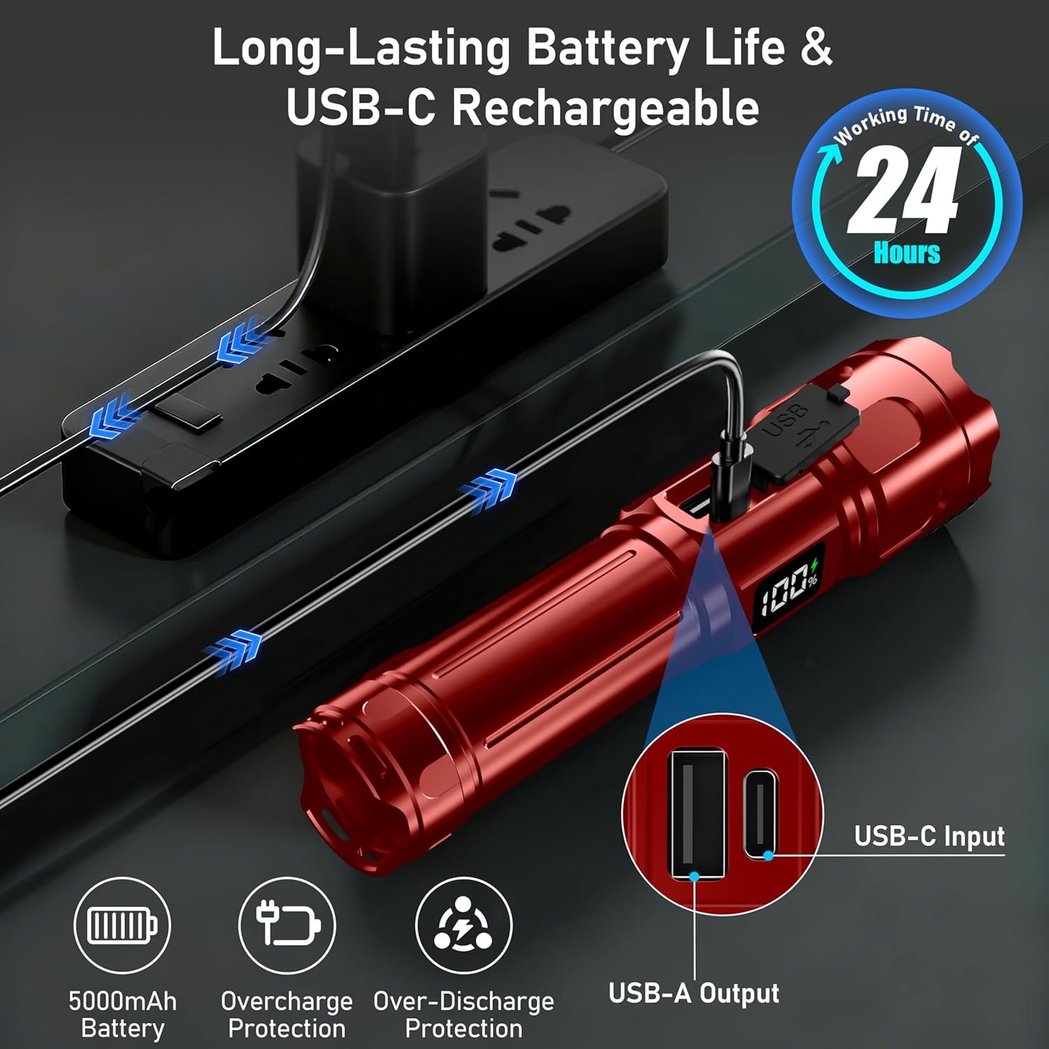Long Battery Life & Clear Digital Display: The flashlight features a built-in 5000mAh battery. A full charge provides approximately 6-24 hours of continuous use (depending on lighting mode). It includes dedicated Type-C input and USB-A output ports, supporting charging via A-C/C-C cables, Transform into emergency power supply at any time. The clear battery indicator monitors remaining power in real time,giving you peace of mind whether you’re on an outdoor adventure or using it daily.