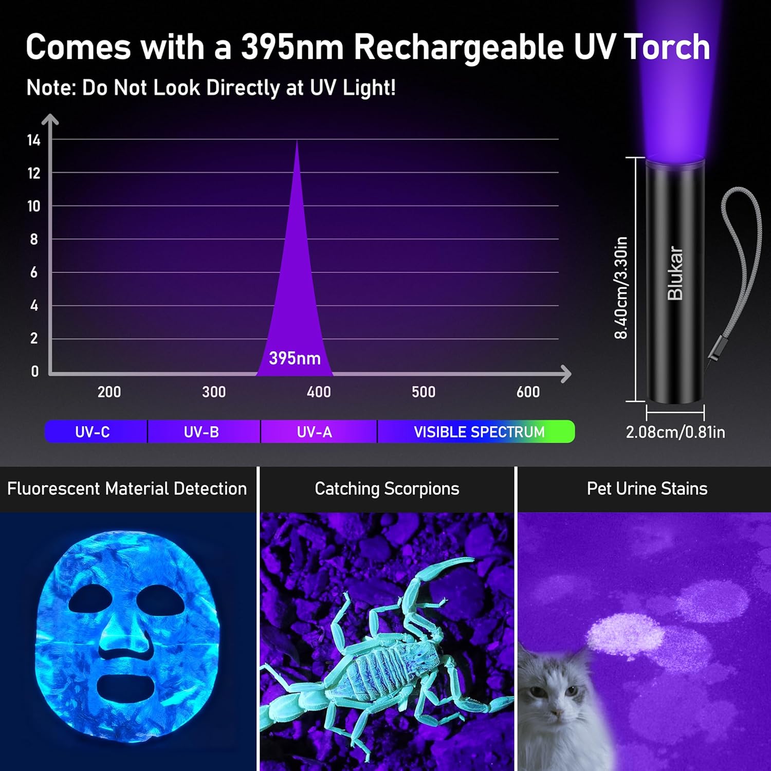 Great Value Kit: Premium Accessory includes: 1*5000mAh battery, 1*395nm UV mini flashlight (a practical tool for detecting pet urine), 3*AAA batteries, 2*USB C charging cables, 4*waterproof sealing rings, 1*dry battery rack, 1*dry battery sleeve, 1*storage box, 2*lanyards, 1*flashlight case. This multifunctional set flashlight is not only essential for camping,fishing,outdoor adventures,dog walking,garage repairs, emergency rescue or other daily uses, but also a great choice for high-end gifts.