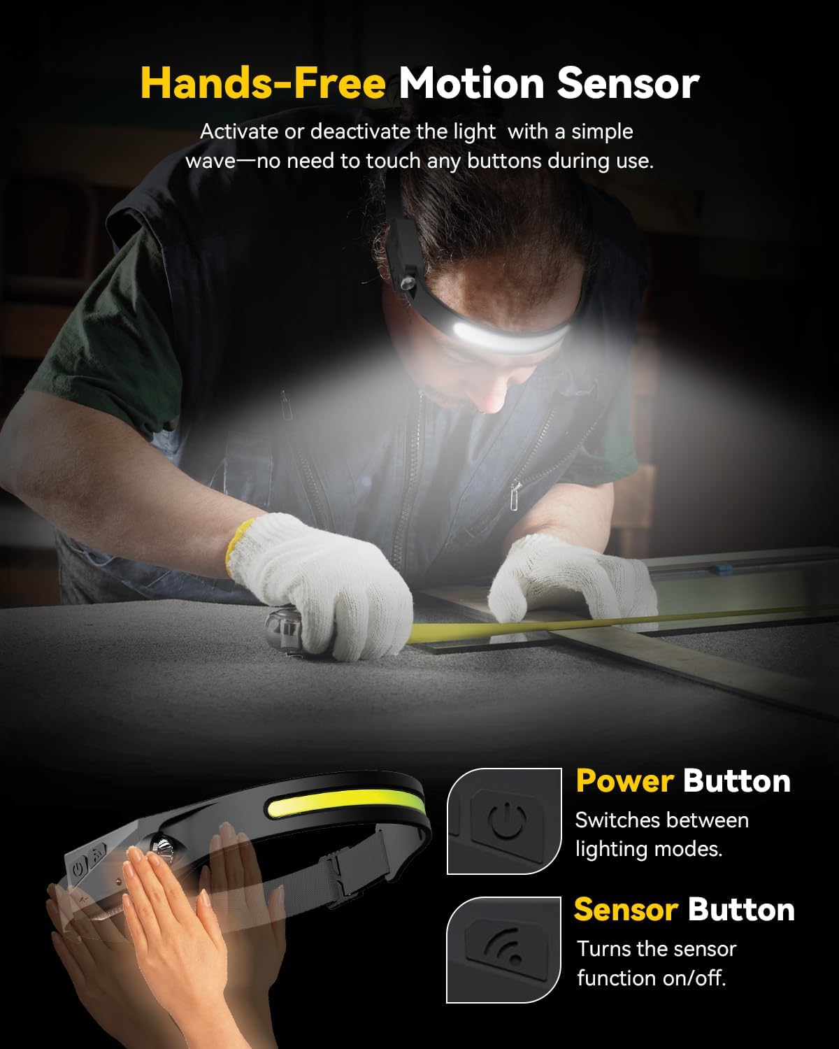 HANDS-FREE OPERATION WITH MOTION SENSOR: Easily activate this head flashlight for adults using the smart motion sensor, providing true hands-free convenience for various tasks. Whether you’re adjusting light settings while working, exercising, or in an emergency, this feature ensures quick and seamless control without touching the headband light.