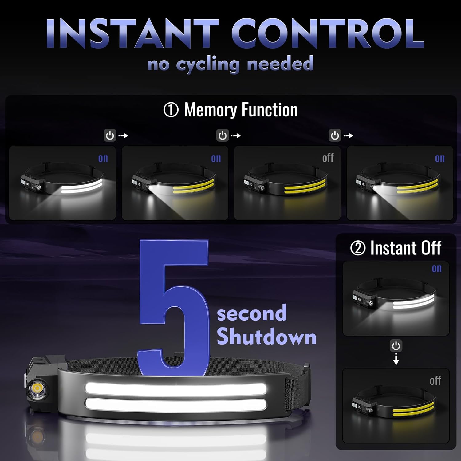 MOTION SENSOR & 7 LIGHTING MODE: Customize your light with 7 versatile modes: including 270° wide-angle COB floodlight (COB High/COB Low/ COB Red) for ambient illumination and ultra-focused XPE spotlight (XPE High/XPE Low) for long-distance visibility up to 150m. Activate emergency strobe with a long-press. Plus, our extra motion-sensing technology lets you turn the head lamp on/off with a simple wave—perfect for gloves-on use during camping, fishing, or repairs. No more fumbling with buttons in the dark
