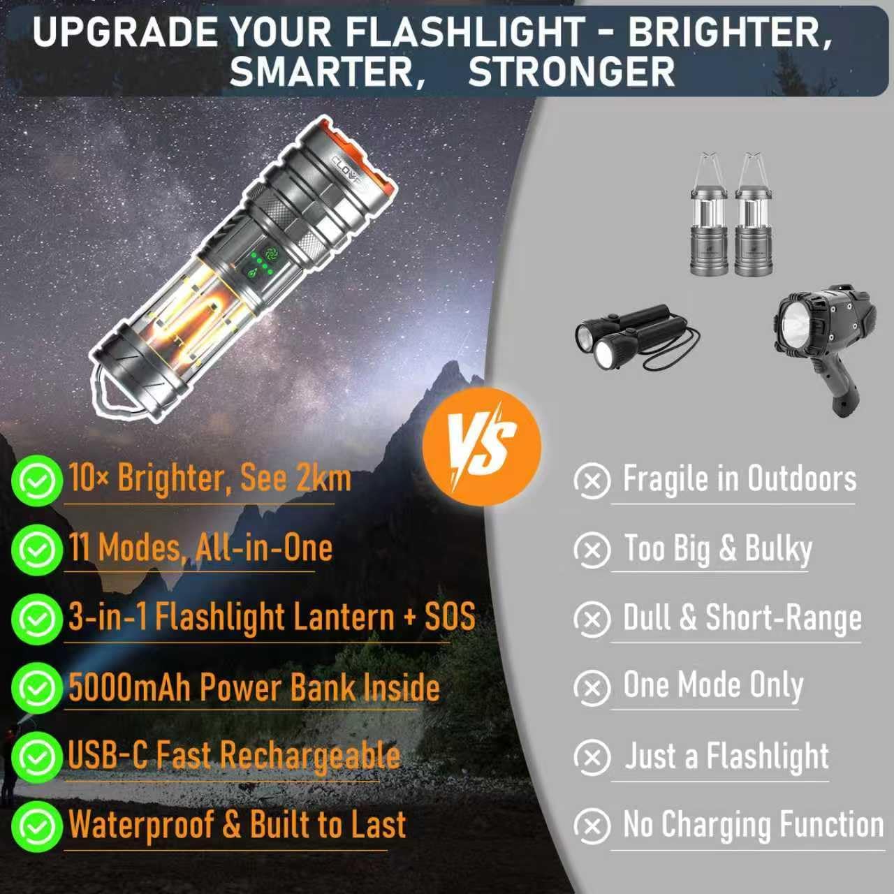 Rechargeable with Power Bank Capability: With a fast-charging Type-C port and a USB output, for easy charging and the ability to act as a 5000mAh power bank, this rechargeable handheld flashlight is a must-have for outdoor and emergency preparedness.
