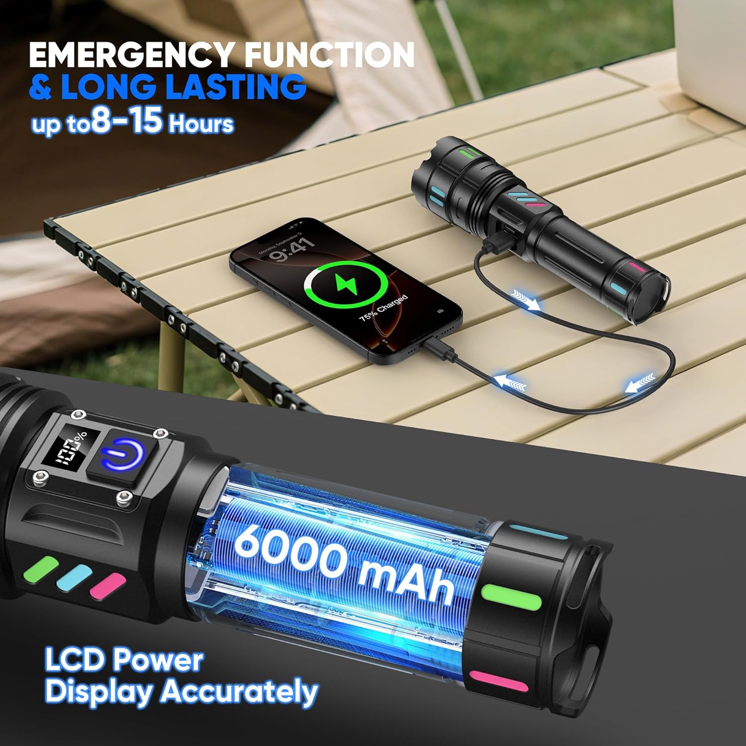 [ MULTIFUNCTIONAL 2-IN-1 USB C CHARGING & DISCHARGING ] The super bright LED flashlight long range is built-in 2 USB interfaces, one is USB C input for charging, the other is USB output for discharging such as it can charge your phone for emergencies. It supports various of USB devices such as smartphone, earphone, computer etc. It is convenient to get charged or discharged in indoor or outdoor activities as the USB C interface is universal that can be replaced.