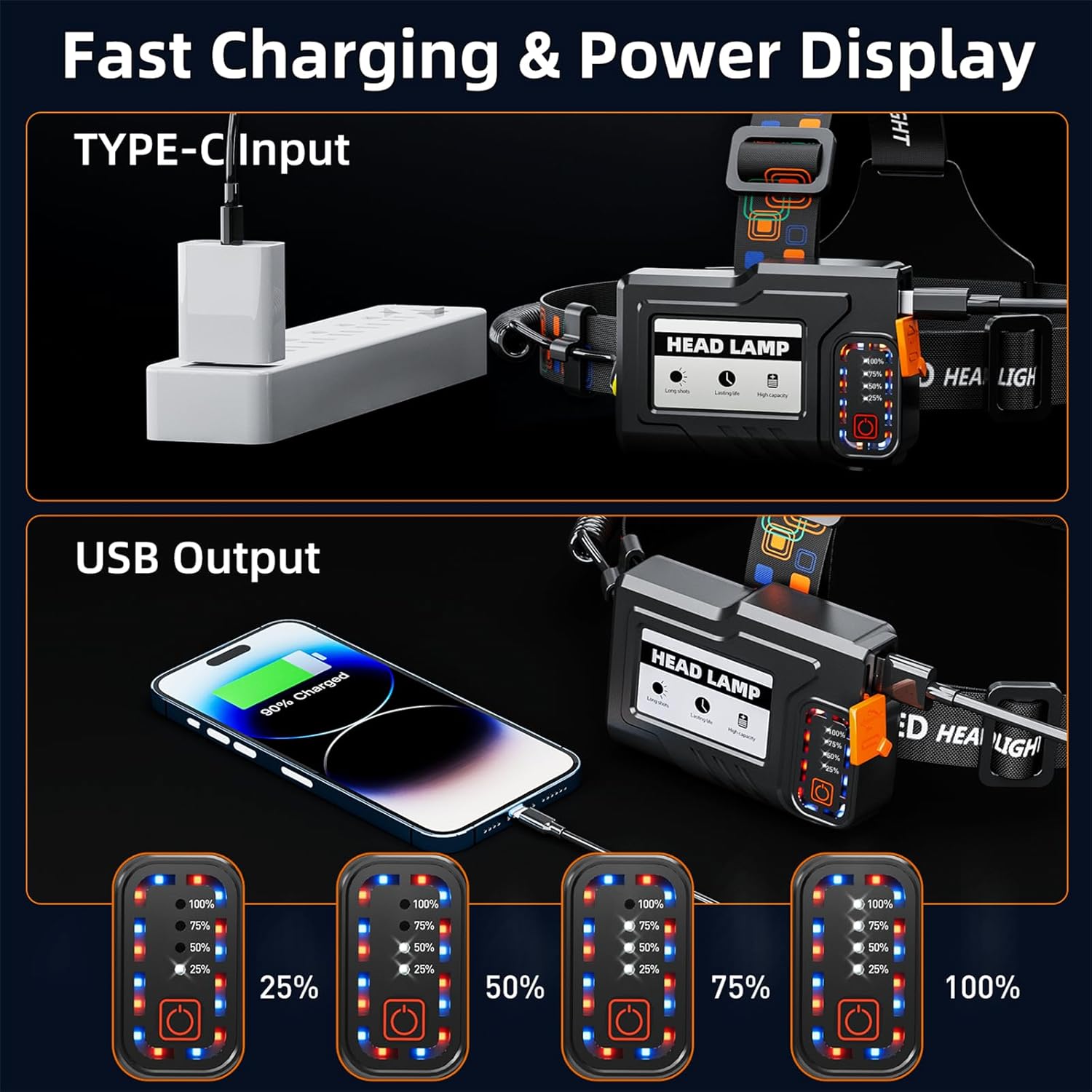 【Type-C Charging & USB Output 】Headlamps is equipped with a Type-C charging cable, which is very convenient to charge the headlamp powered through a power adapter; the hardhat headlamp can be fully charged in just 4-6 hours. It is also equipped with a USB output function, and the high-power headlight can also be used as a power bank to charge your smart devices. In addition, head lights for forehead also feature overcharge protection.
