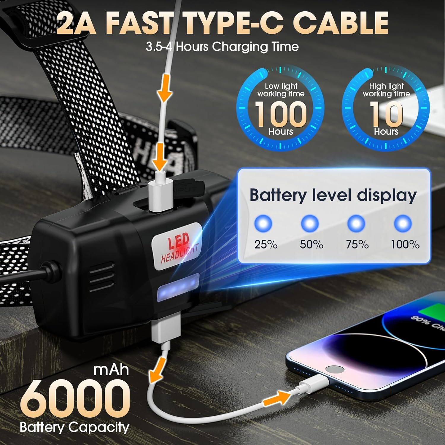 【Fast Charging and Long Battery Life】The rechargeable headlamp is equipped with a 2A fast TYPE-C cable, which charges very quickly. If you use an adapter with a rated current of 2A, it only takes 3.5-4 hours to fully charge. The battery capacity of this headlamp is 6000 mAh, which can work for 10 hours in high light mode and 100 hours in low light. It can also be used as a mobile power bank to charge your mobile phone when you encounter an emergency
