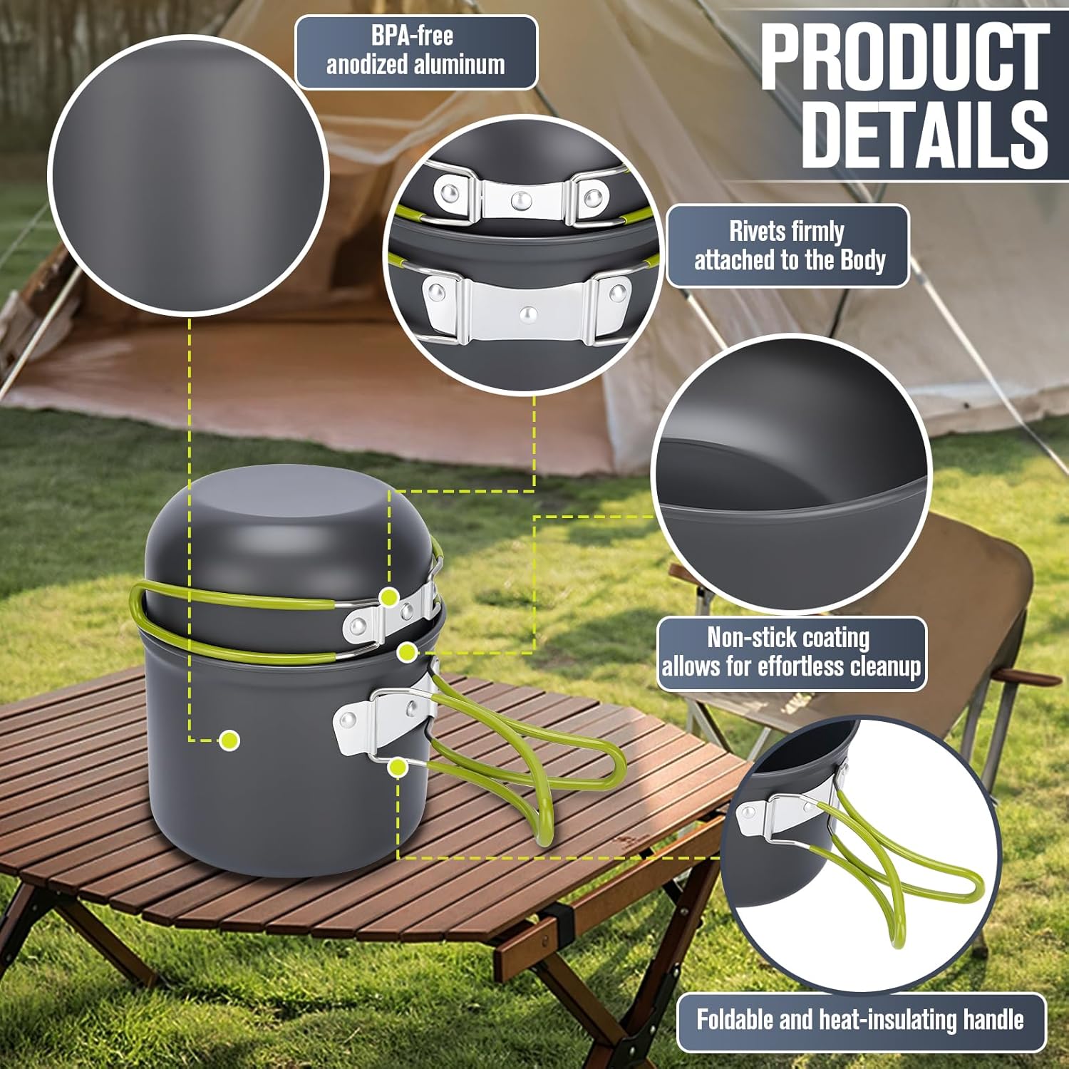 Camping Cookware Set, Lightweight Backpacking Mess Kit with Camping Pots and Pans, 2 Cups, Fork Spoon, Survival Cooking Kit for Outdoor Hiking
