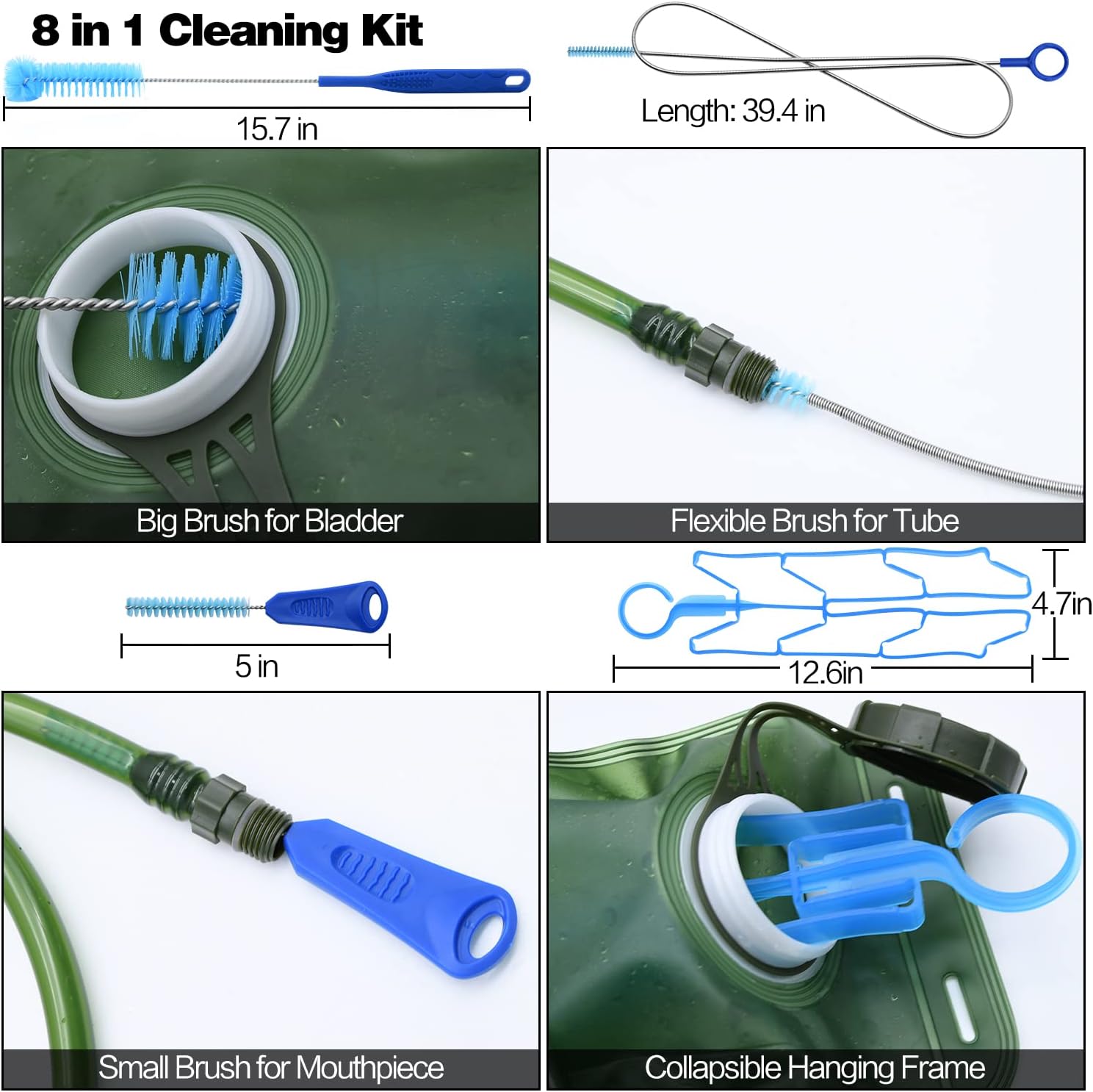 【8 in 1 Cleaning kit】- Cleaning kits can effectively clean your water bladder without other tools. Small and flexsible brushes can clean the dirt in the mouthpiece and water hose. Big brush can clean the dirt in the bladder interior. Foldable drying racks can be extended to 4.7 inch to dry the water bladder.