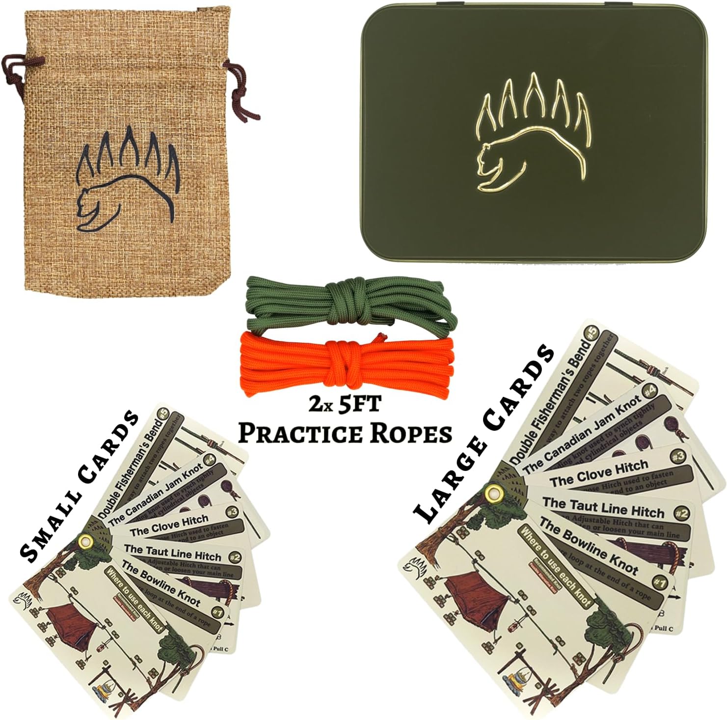 Choose Your Ideal Kit: The Bear Essentials Knot Tying LARGE Kit comes with a credit-card sized knot cards and a larger card for an additional easier-to-read print — ideal for those who prefer clearer visuals. Each set of knot tying cards features the 10 essential outdoors knots – bowline knot, taut line hitch, clove hitch, Canadian jam knot, double fishermans bend, rolling hitch, prusik, alpine butterfly, square lashing, and tripod lashing.