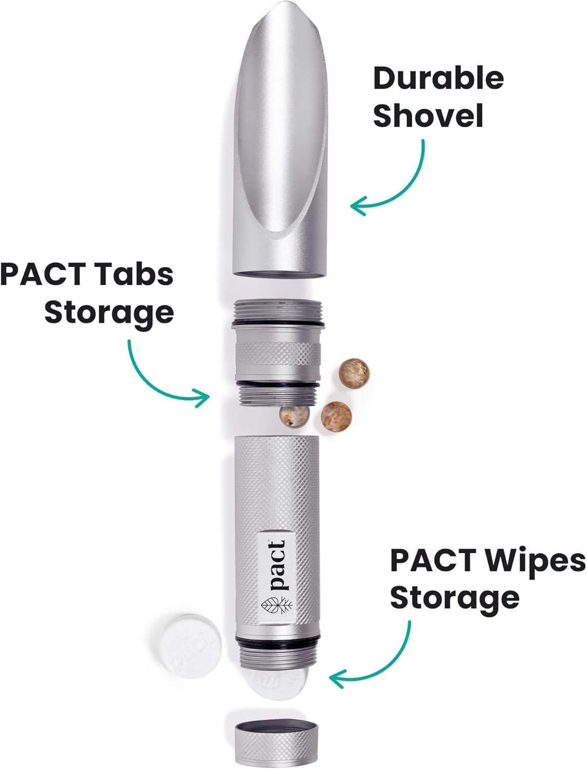 WHAT IS THE PACT ULTRA LITE BATHROOM KIT? The PACT Ultra Lite Kit is an all-in-one backcountry bathroom kit for digging a hole and burying your poop. It’s the lightest, most environmentally friendly way to bury your poop. Each kit includes (1) ergonomic, durable shovel with storage compartment in the handle, (1) resealable pouch of (60) PACT Mycelium Tabs and (1) resealable pouch of (20) compressed, plant-based PACT Wipes.