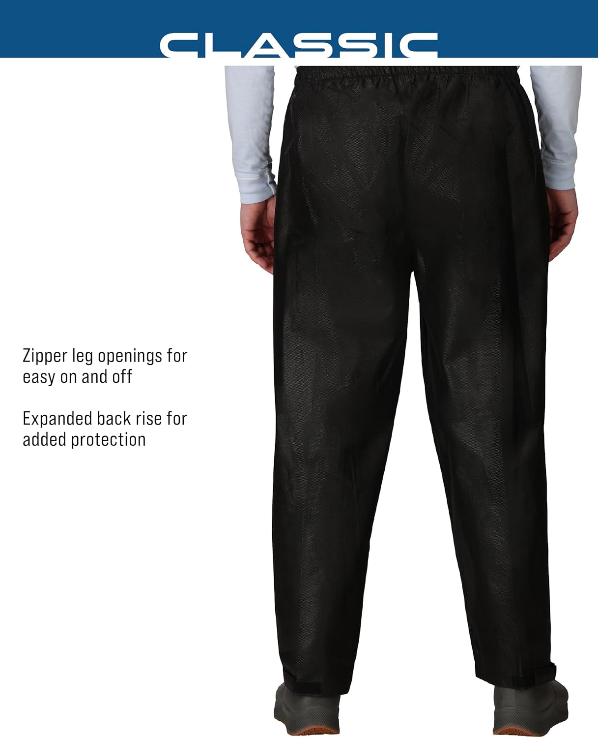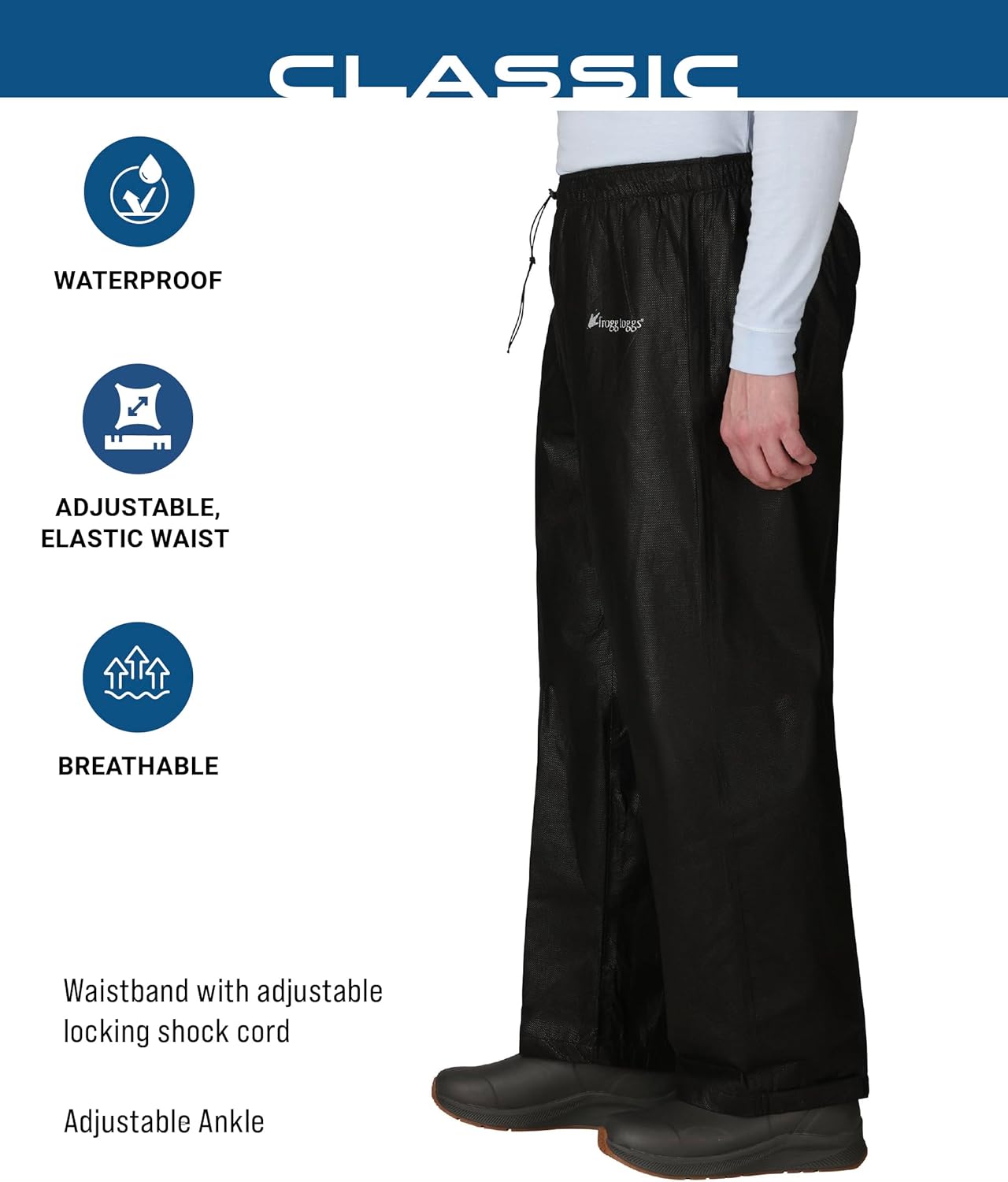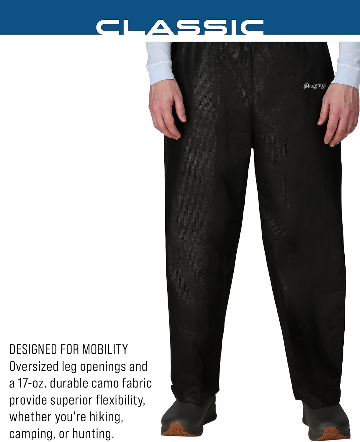 The Frogg Toggs Classic Pro Action Rain Pant is perfect for hunting, fishing, jogging, hiking, biking, camping and many more outdoor activities. The pants feature an adjustable, elastic waist that allows for a customized and secure fit. The expanded 4″ back rise ensures the pants will fit under any rain jacket for overall coverage to keep you dry. Oversized leg openings with hook-and-loop adjustments allow the pant to fit easily over your favorite pair of rain boots or shoes, providing a level of convenience you’ll only experience with Frogg Toggs. Welcome to Frogg Toggs. We believe that premium materials, exceptional construction and innovative features should be standard and still affordable. We work hard to get you the fit and performance you need for your active lifestyle.