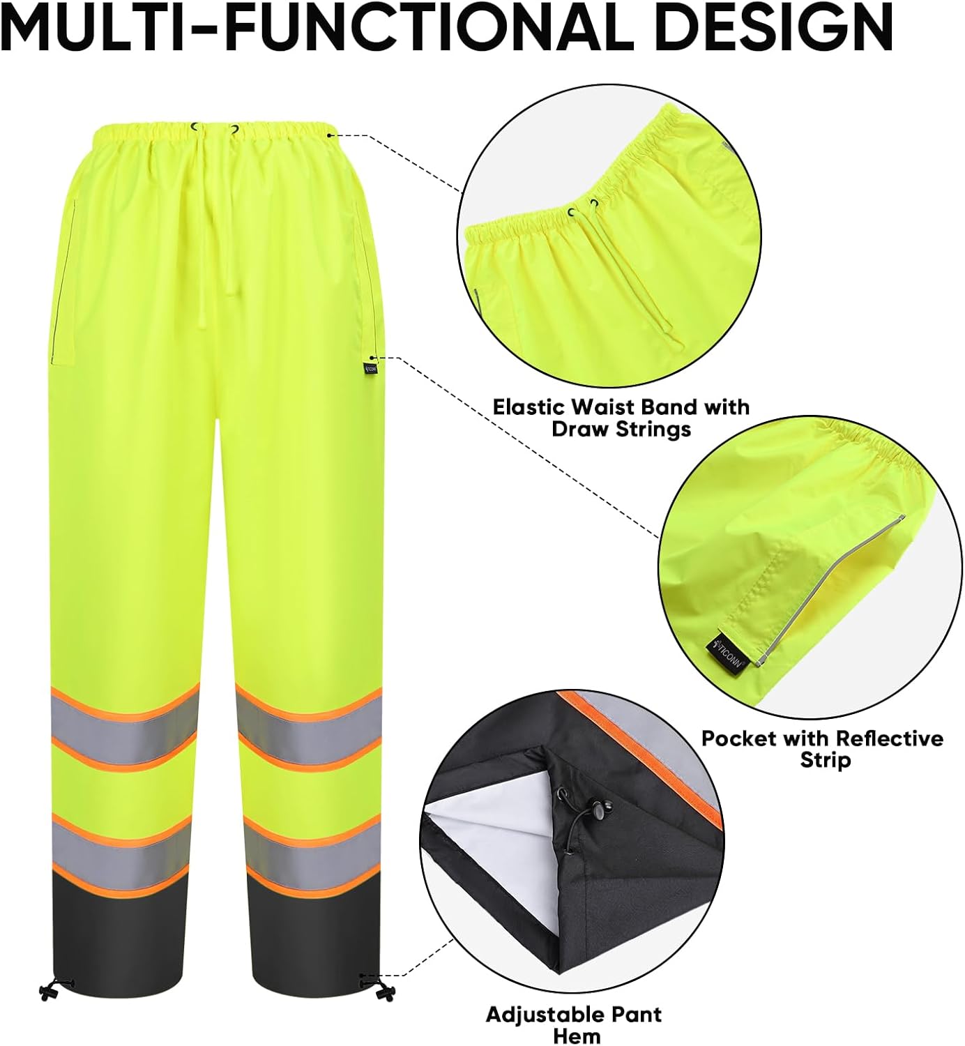 Elevate Your Safety and Comfort with This Safety Rain Jacket men and Pants Set, meticulously crafted from 100% polyester 150D Oxford fabric and enhanced with a durable PU coating; This mens rain jacket waterproof material ensures that the waterproof jacket is not only lightweight but also fully waterproof, breathable, and resistant to tears, guaranteeing long-lasting durability and performance; The men rain jacket and Pants Set Meets ANSI Class 3 Safety Standards, featuring 2-inch high-visibility reflective tape that wraps 360 degrees around the garment, hand-stitched for enhanced durability; In addition, the innovative extra orange reflective strips significantly boost your visibility, ensuring you are seen in low-light or hazardous conditions; Designed with Practicality in Mind, this lightweight rain jacket men reflective rain suit comes equipped with two large pockets on both the jacket and pants for ample and convenient storage of your essentials; The rain coats for men jacket is designed with a robust zipper that features a rain flap and a windproof neckline, offering superior protection against both water and wind; A transparent ID pocket and a D-ring for tool hanging add to the suit’s versatility; The adjustable cuffs, hems, waistbands, and trouser legs of both the yellow raincoat jacket and pants ensure a customizable fit, enhancing comfort and ease of movement; Perfect for Use in a Variety of High-Risk Environments, including ports, airports, highways, and construction sites, this rain gear for men waterproof rain suit is ideal for professionals such as construction workers, truck drivers, traffic police, and security personnel; Whether you’re facing challenging weather conditions or working in hazardous settings, experience the blend of durability, visibility, and comfort tailored to meet the highest standards of safety and performance as a rain ponchos for adults