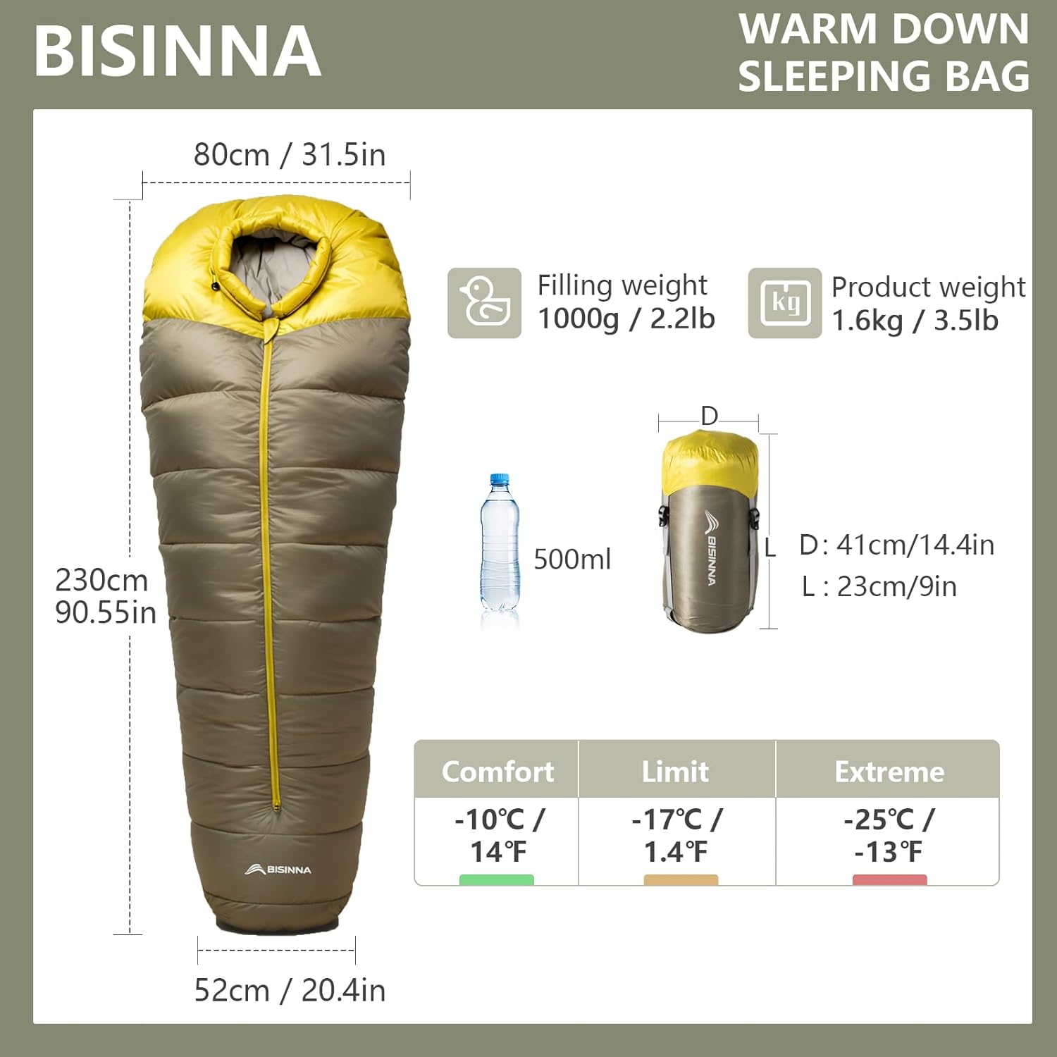 【All-Season Versatility】Your perfect sleep solution for any adventure. Choose from three optimized fill weights: the 600g/ 800g /1000g, corresponding to the comfort temperature scale of 30.2 / 17.6/ 14℉ respectively making it your go-to bag for year-round use.