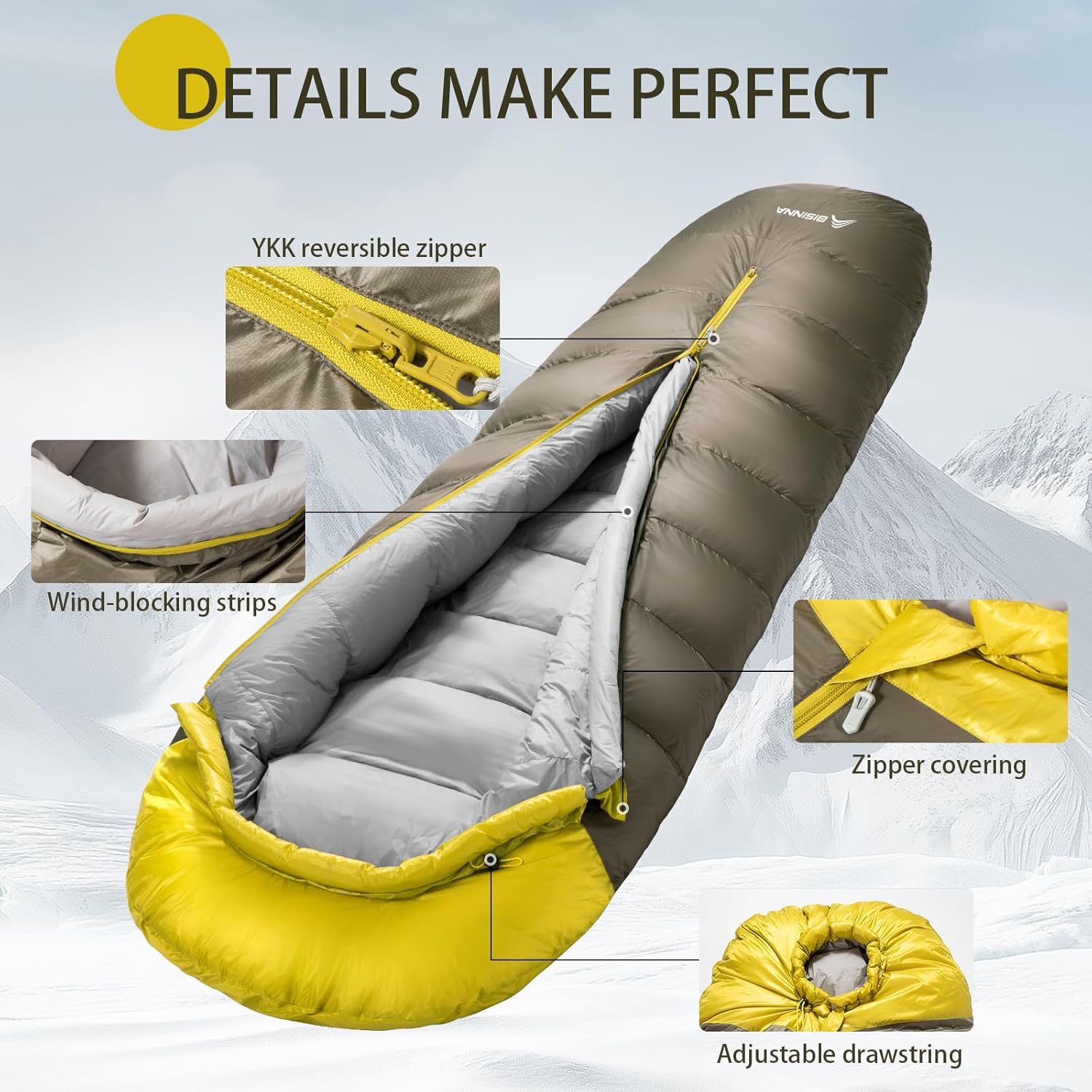 【Innovative Warm Desgin】This Mummy down sleeping bag Unmatched ventilation and flexibility. The unique center zip design allows for easy temperature control and makes getting in and out of the sleeping bag easy . Coupled with the full-length draft tube, it effectively prevents heat loss, ensuring no cold spots.