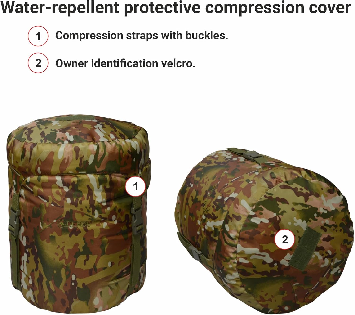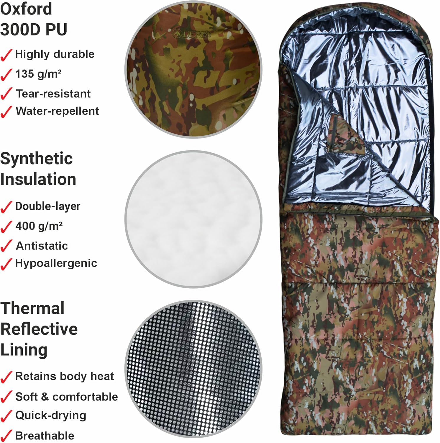 Made in Ukraine & Reliable: Military-style camouflage sleeping bag, rigorously tested for durability, strength, and long-lasting performance in extreme outdoor conditions.
