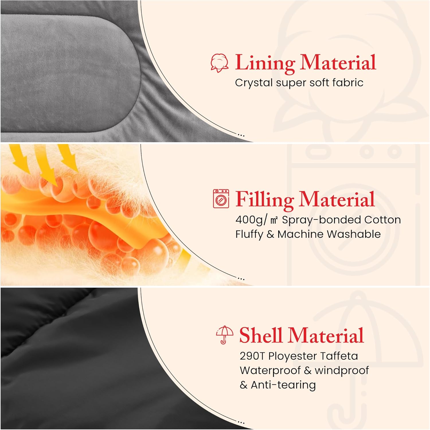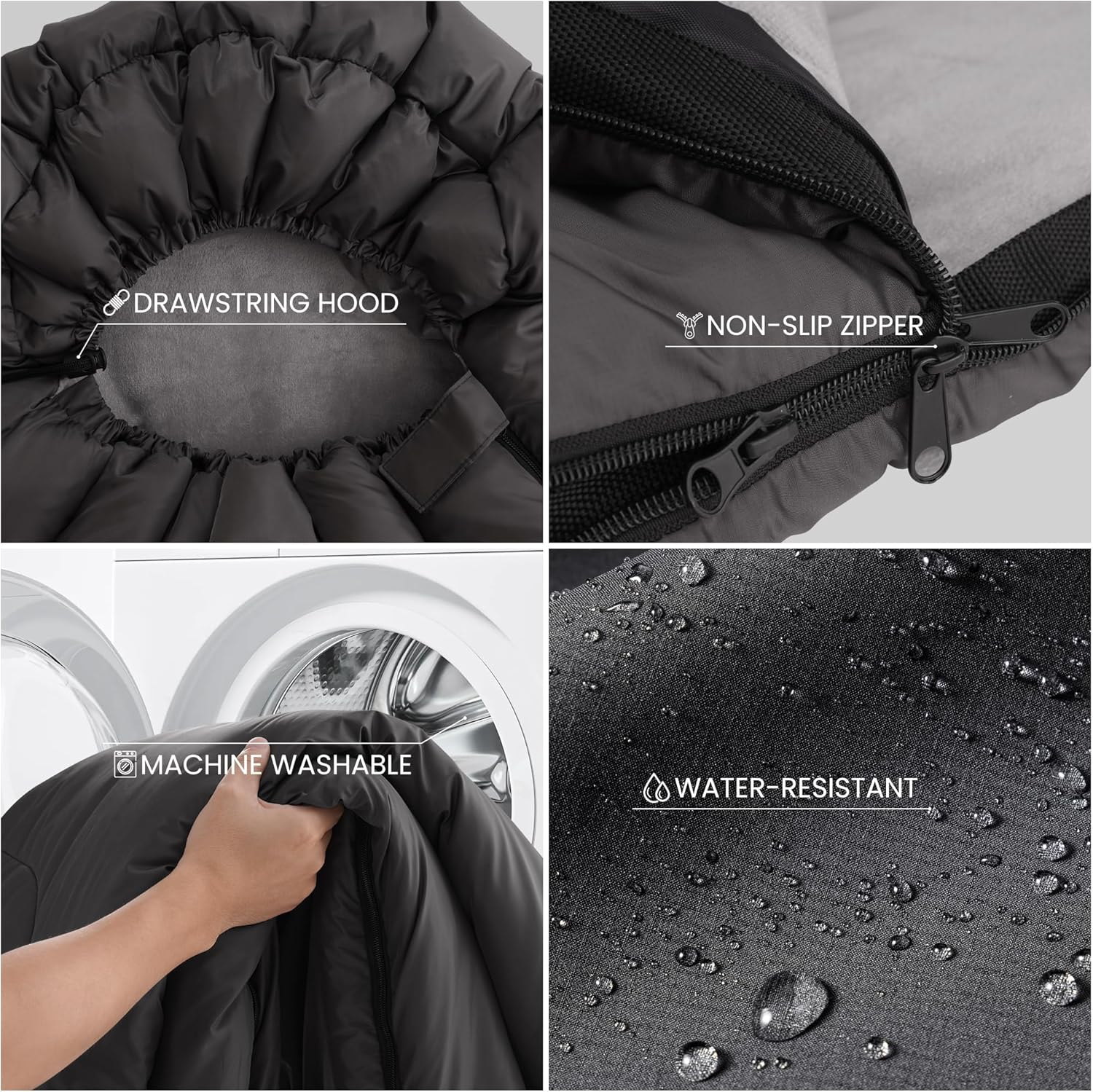 [Premium Materials] – This sleeping bag combines a waterproof windproof fabric with a cloud-soft Microplush Fleece lining. Its 400g/㎡ Silk-Like Cotton filling surrounds you on all sides to eliminate heat loss, guaranteeing peaceful warmth in temperatures from 32°F to 50°F (0°C to 10°C), and even down to 14°F (-10°C) at its limit.