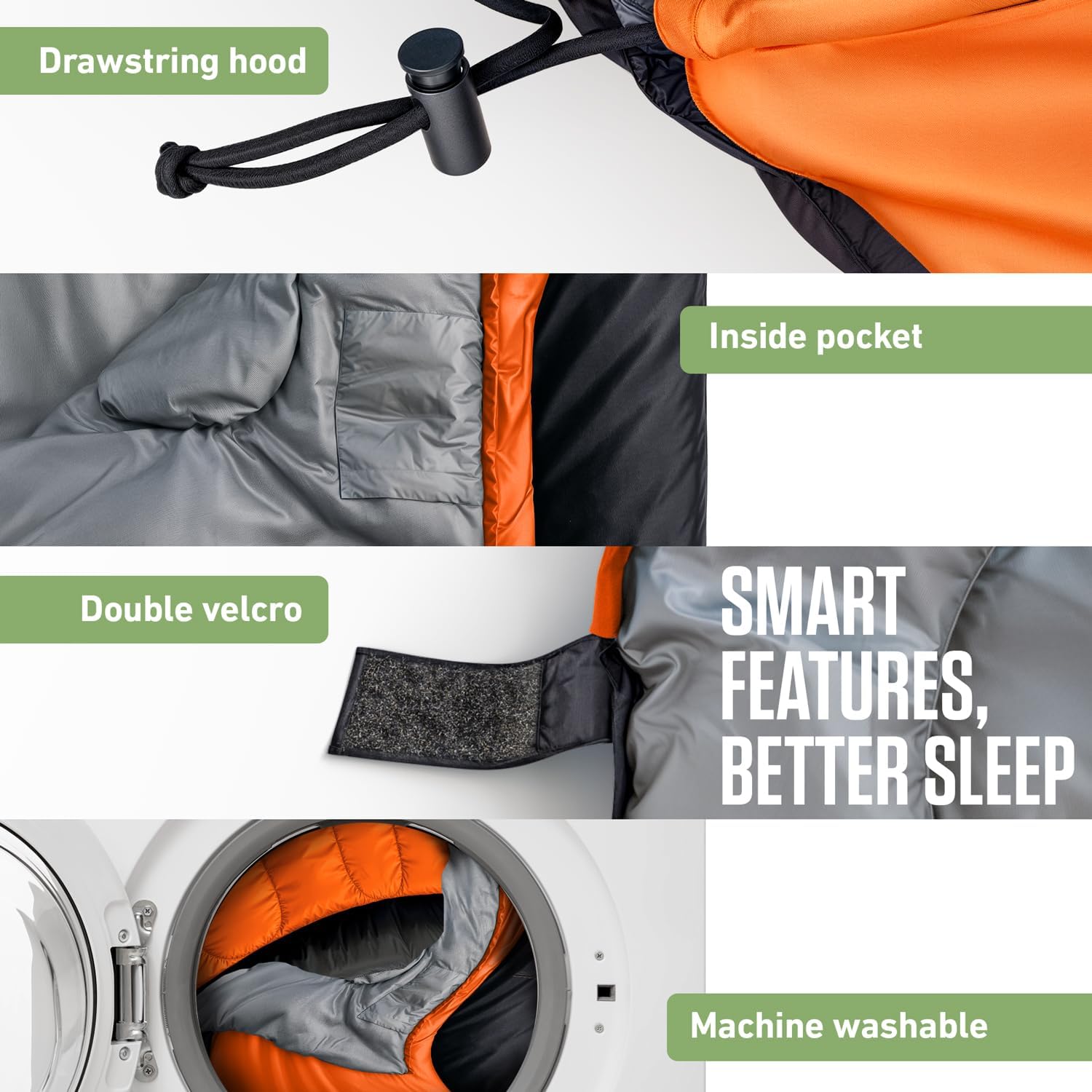 DURABLE, WATER-RESISTANT & EASY TO CLEAN – Built tough with high-grade polyester, this sleeping bag resists wear and moisture. The water-resistant shell keeps you dry, and it’s machine washable for effortless maintenance.