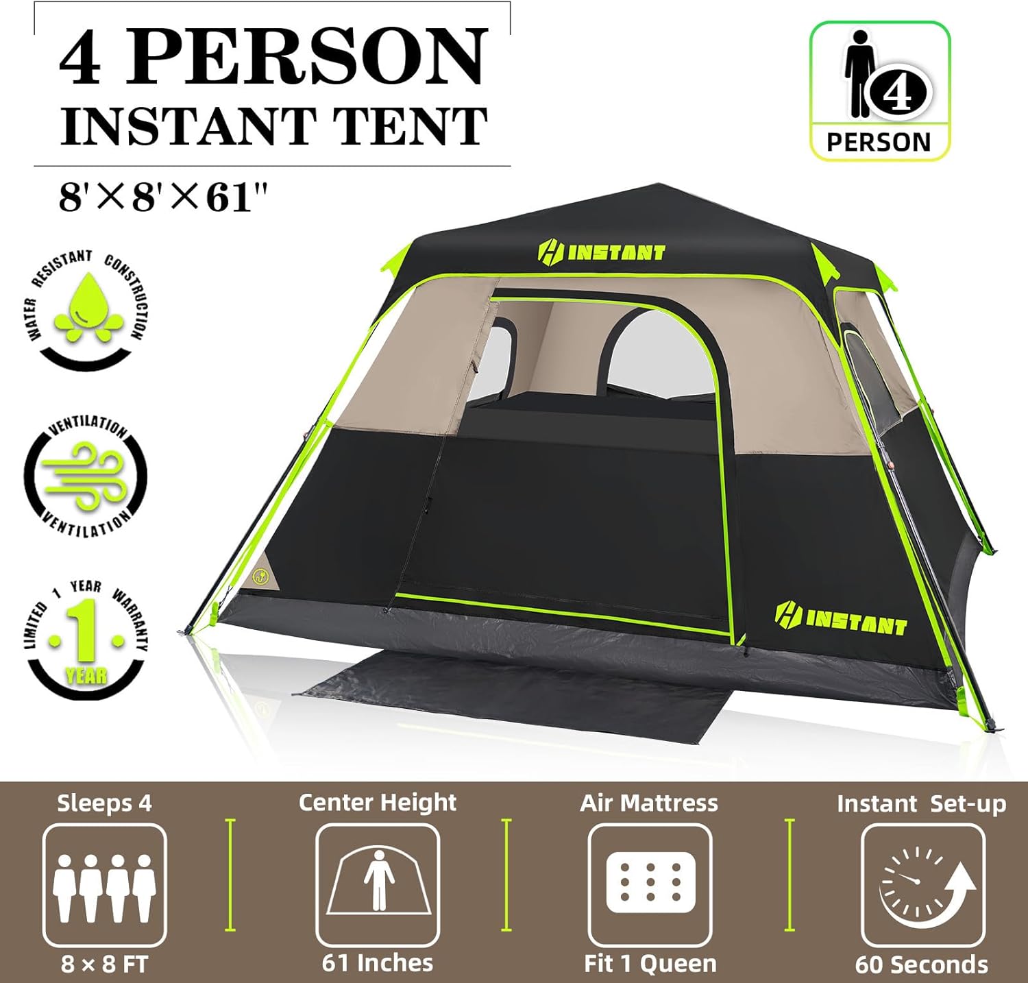 【Waterproof & Windproof】: The camping tent is made of 190T waterproof PU 2000mm polyester taffeta fabric. The 4 person instant tent is equipped with a rainfly with waterproof tape on all seams and the floor is made of PU3500mm 120g PE fabric to give you all-around protection. The easy pop up tent is equipped with 10 thick stakes and 4 adjustable guylines to enhance wind resistance. Everything is just to provide with a safe and comfortable camping shelter.