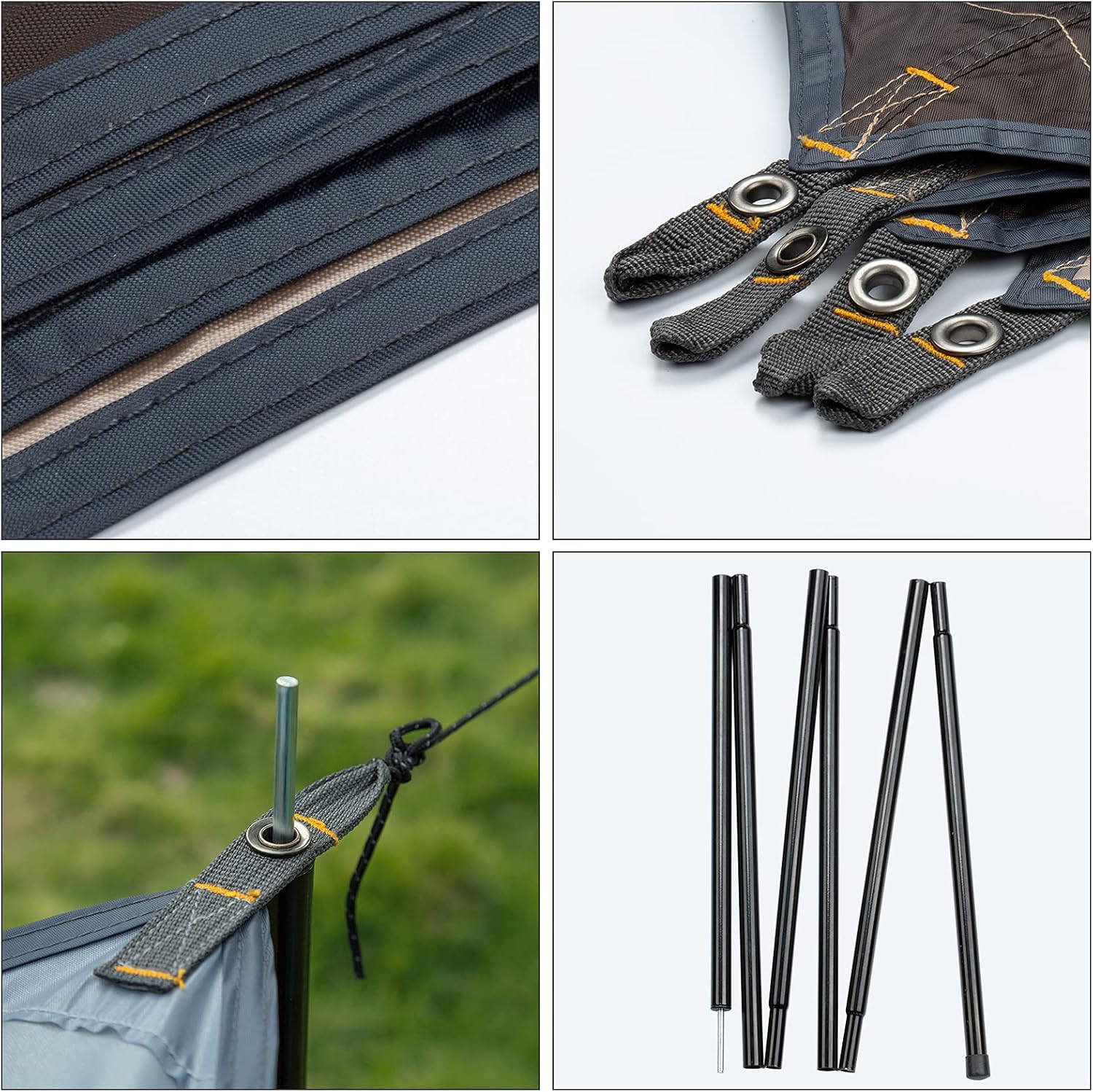 Easy Set Up: Just a few simple steps can set up. It is supported by two 2.1m iron pole with a diameter of 17mm and a wall thickness of 1mm, with binding points x6, iron nails x8 and (6m x2 and 3m x4) wind ropes.The length and toughness of the rope make the tarp stable for use in a variety of environments.