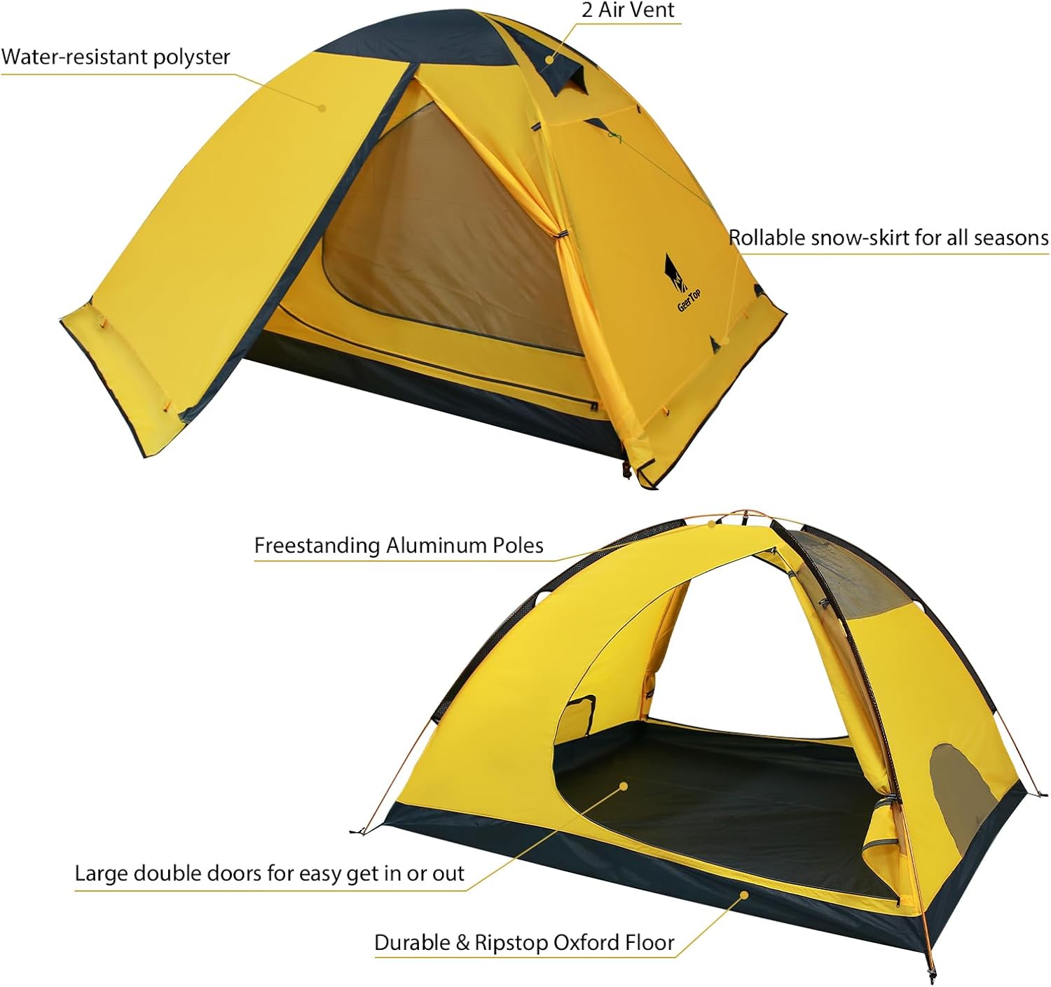 Geertop 4 season Tent for camping is made of high quality material which is fully rain proof and extremely light weight; 210T breathable polyester for inner tent, 210D PU 5000 mm Oxford fabric for the floor and 210T PU 3000 mm anti-tear checkered polyester for the fly tarp; Also double stitched seams sealed perfectly to improve the waterproof better, keep dry well