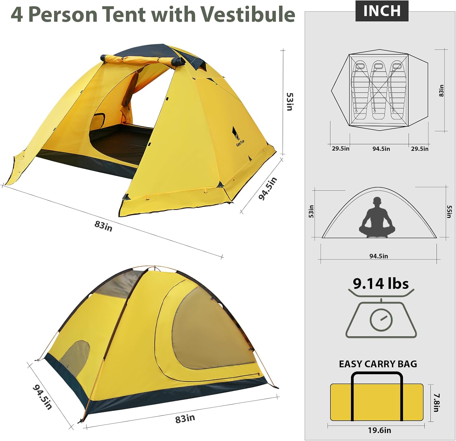 【Lightweight & Backpacking Tent】This 4 person ultralight dome tent only weighs only 9.1 lbs; Pack into a compact size for backpacking travel ; Waterproof and Durable , the strong aluminum poles add plenty of stability & double-zipper let us can pull the zipper inside or outside, convenient to get in or out