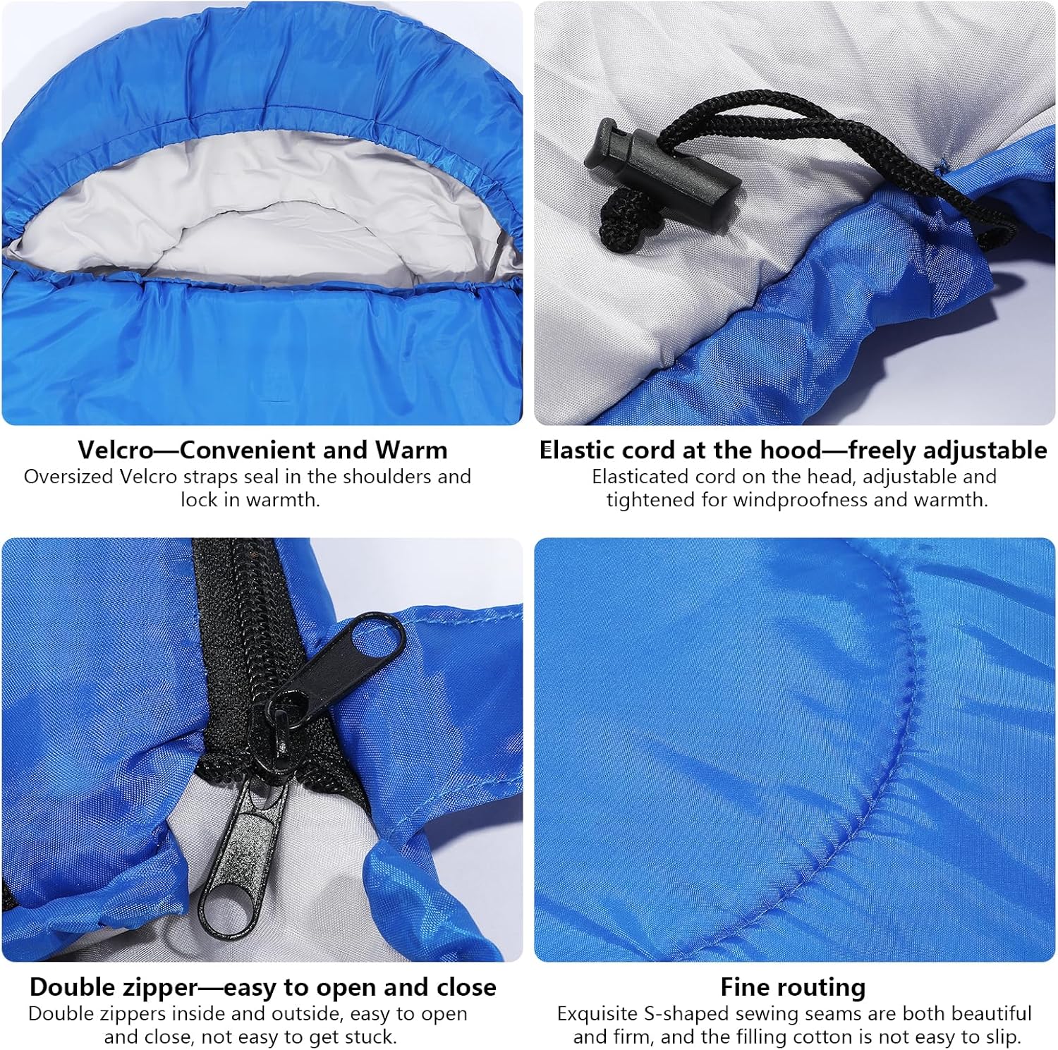 Carefully designed:The camping sleeping bags has a double-sided zipper that is not easy to get stuck and is super comfortable to use. Pull the drawstring on the headrest to make the sleeping bag closer to your head. The “U”-shaped design of the sleeping bag head has a better warmth and windproof effect. The high-viscosity Velcro design prevents the zipper from accidentally opening and cold air from entering