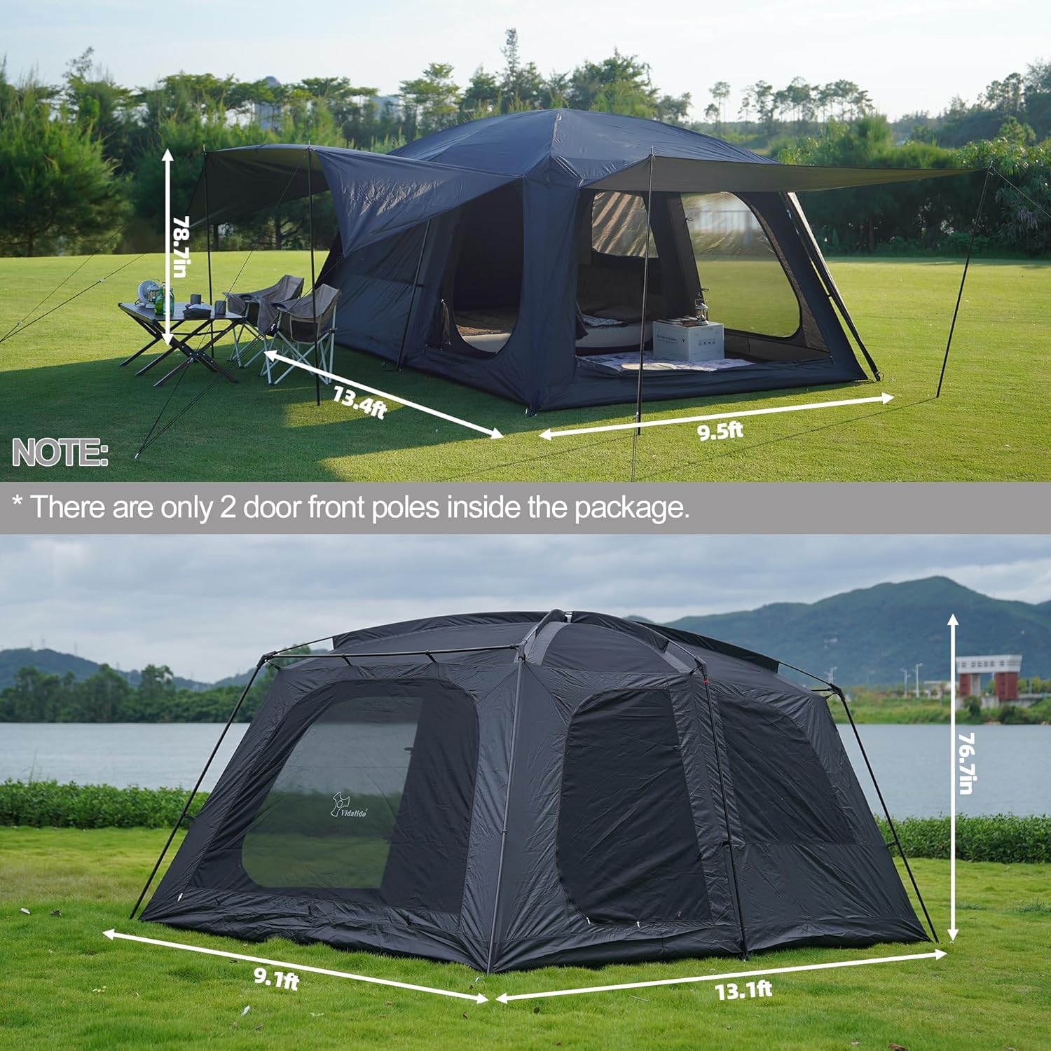 ROOMY FOR 8-10 PERSON TENT: The tent is perfect for 8-10 person outdoor camping. With the size of 13.1ft x 9.1ft x 76.7in(H) (119.2 sq ft). 2 queen air mattresses (6.7ft*5ft/200cm*150cm, thickness suggest below 7.8in) or 8-10 sleeping bags are well fit in the tent. Perfect for family camping or adventures with friends.