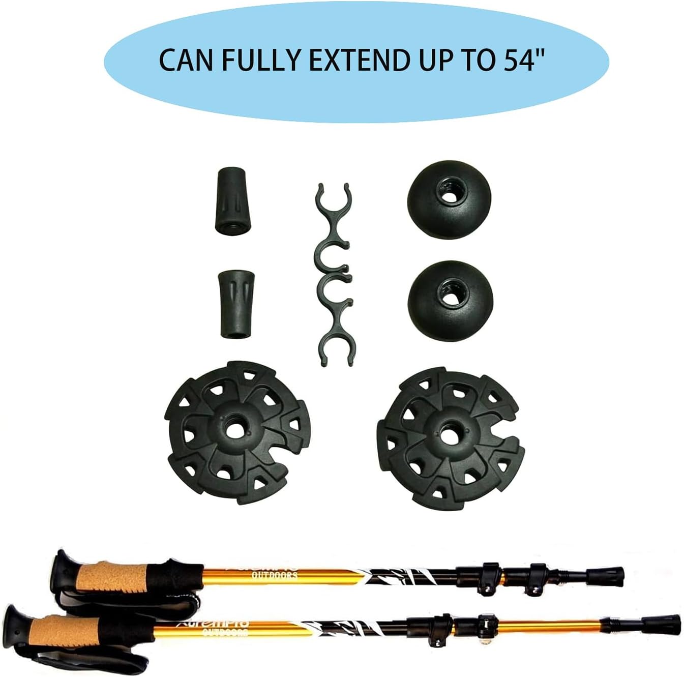 Included: Climate terrain screw on adapters for stick footing when used in the snow, hills, mountains, hiking through muds, Iced, dirt, gravel river crossing, hard, flat, sandy or rocky surfaces, plus a utility tide string carrying bag to store your trekking sticks when not in use. (4 Rubber Tips – Use for flat, hard, rocky surface), (2 Snow Baskets – Prevent Poles from sinking into snow), (2 Mud Baskets –Use to prevent sinking into soft ground or soil like sand, mud, silty, clay.)