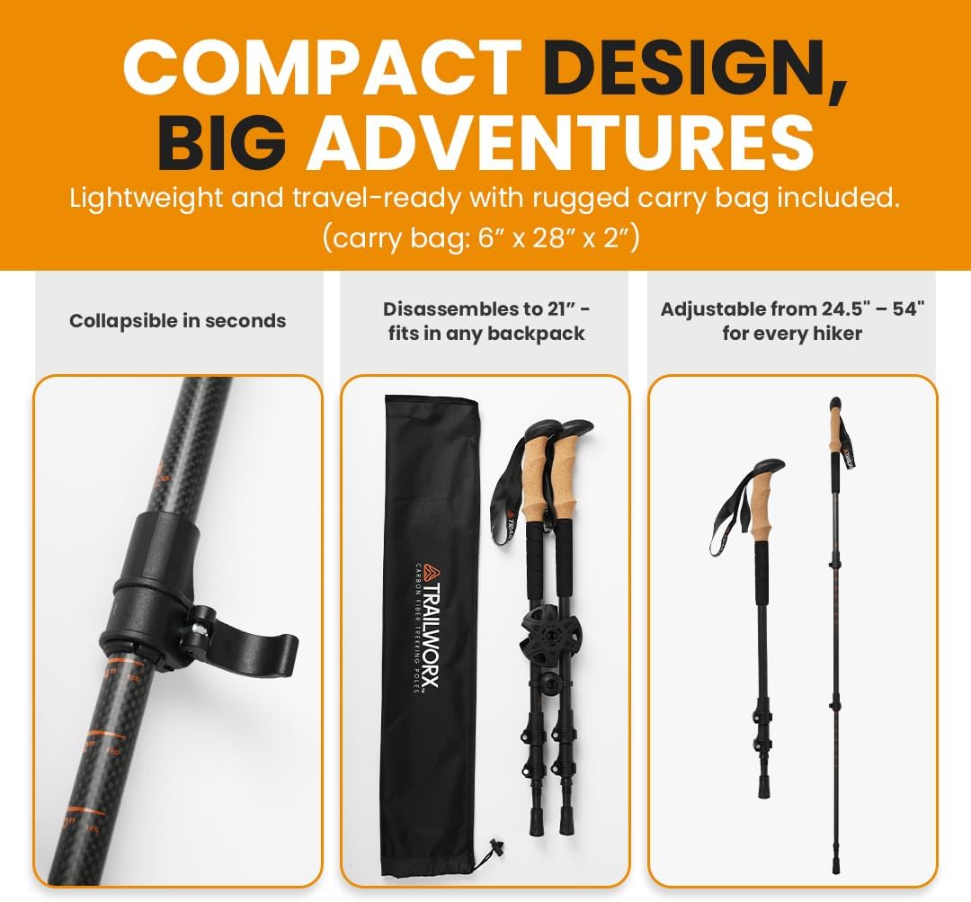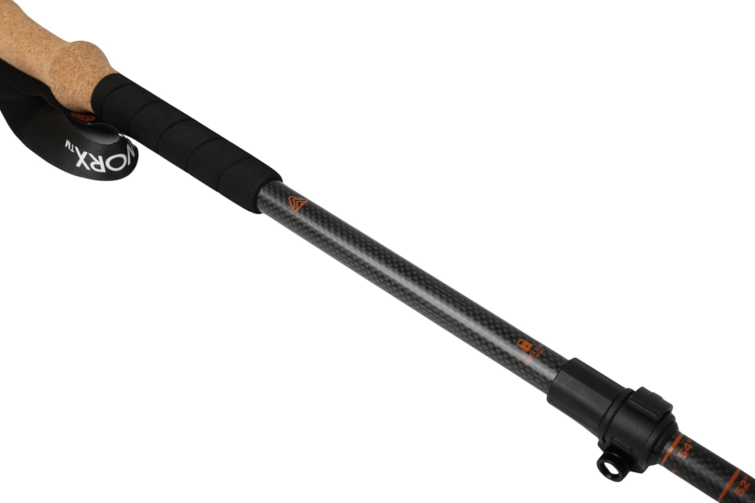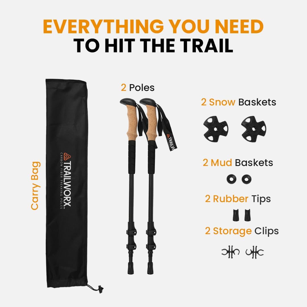 Trailworx Carbon Fiber Collapsible Hiking Poles – Perfect for Hiking, Trekking, and Walking Enhance your outdoor adventures with the Trailworx Carbon Fiber Collapsible Hiking Poles. These lightweight and durable trekking poles are ideal for hiking, trekking, hunting and walking. Featuring ergonomic cork handles and EVA foam grips, they offer superior comfort, making them perfect for both men and women. The adjustable length (24.5″ to 54″) ensures a customizable fit, while the tungsten carbide tips provide excellent traction on various terrains, from rocky trails to soft soil. This complete set includes snow and mud baskets, a carry bag, and storage clips, making them easy to store and carry on any journey. Whether you’re looking for walking sticks for hiking, trekking poles for hiking, or hiking poles for women, these collapsible hiking poles are your go-to solution for a reliable and comfortable hiking experience.