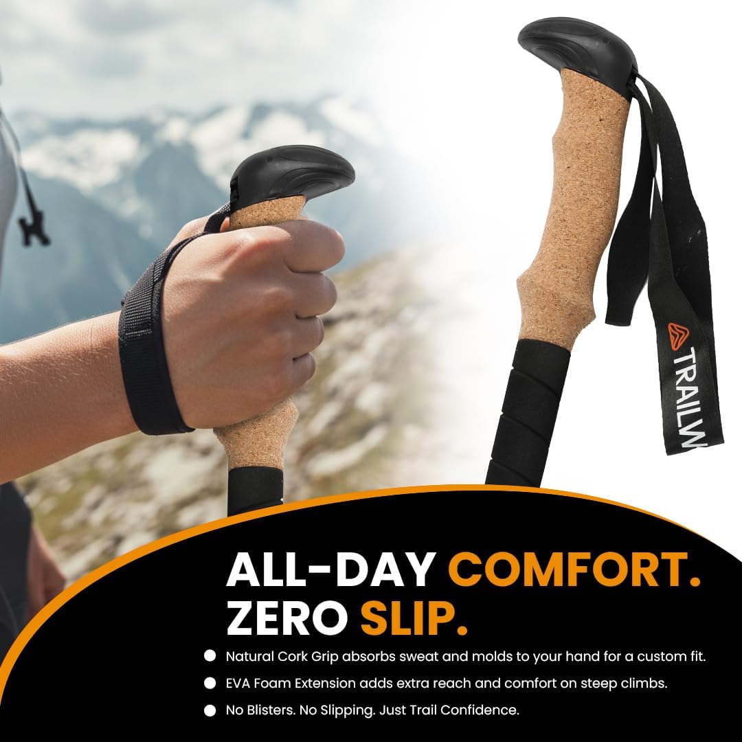 Ergonomic Cork Handle & EVA Foam Grip: Designed for comfort, the ergonomic cork handle offers a secure, sweat-resistant grip, while the EVA foam extension grip provides added support during uphill climbs. These hiking sticks are perfect for seniors or anyone needing extra balance and control on challenging terrain.