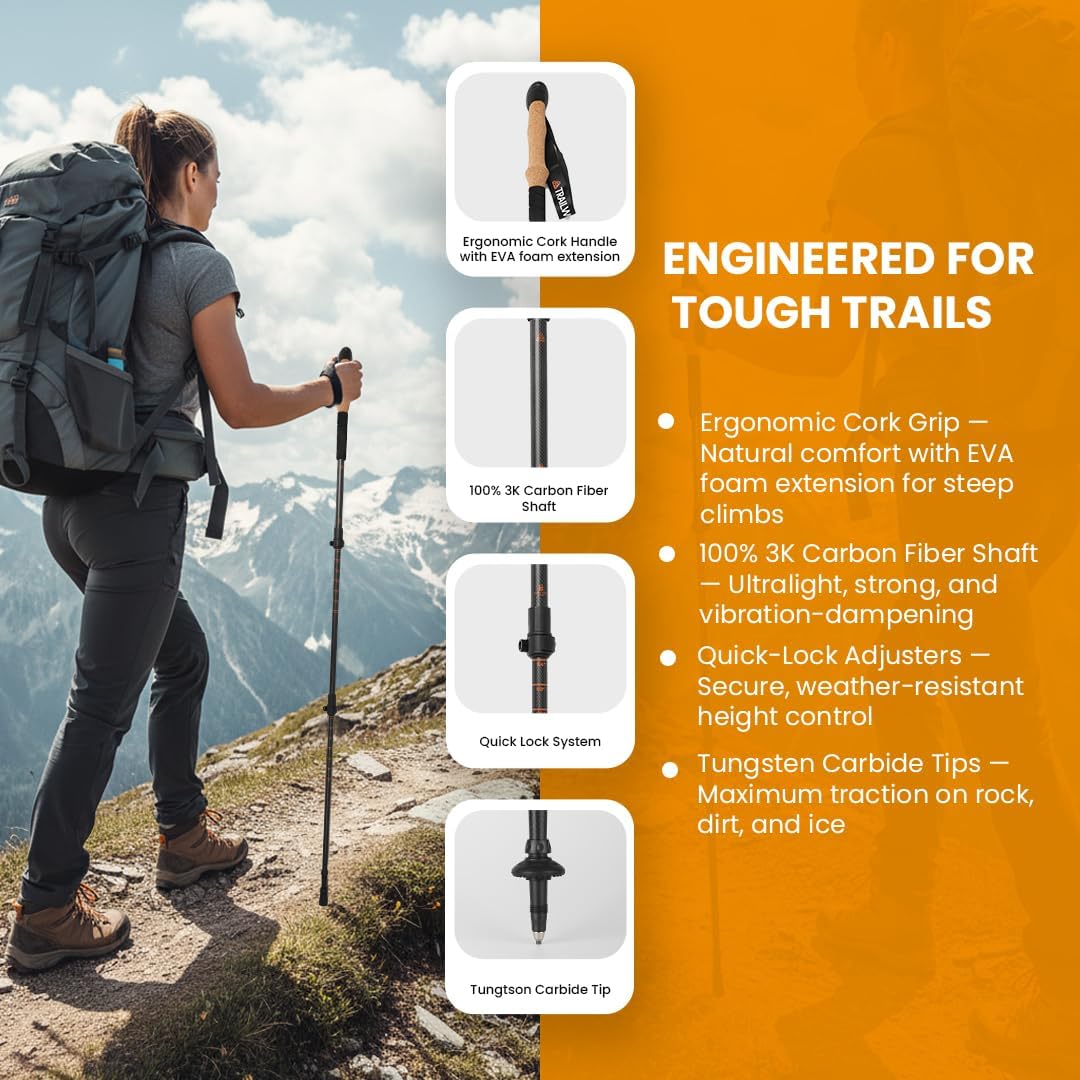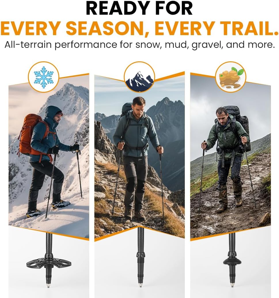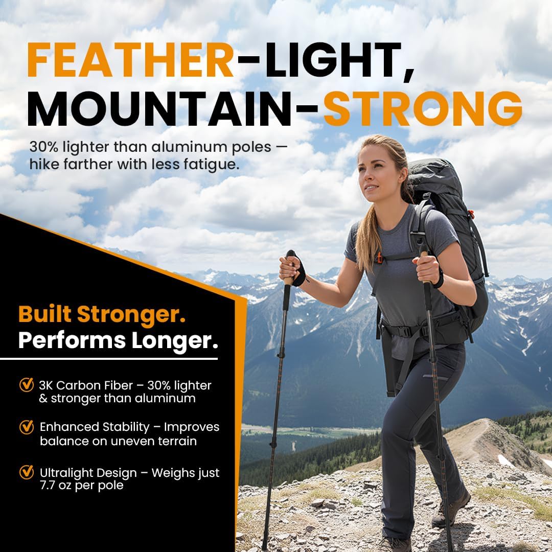 Durable & Lightweight Hiking Poles: Made from 100% 3K carbon fiber, these collapsible hiking poles are incredibly lightweight, making them perfect for long treks, hiking, and walking. Ideal for both men and women, these trekking poles for hiking ensure durability and comfort without weighing you down