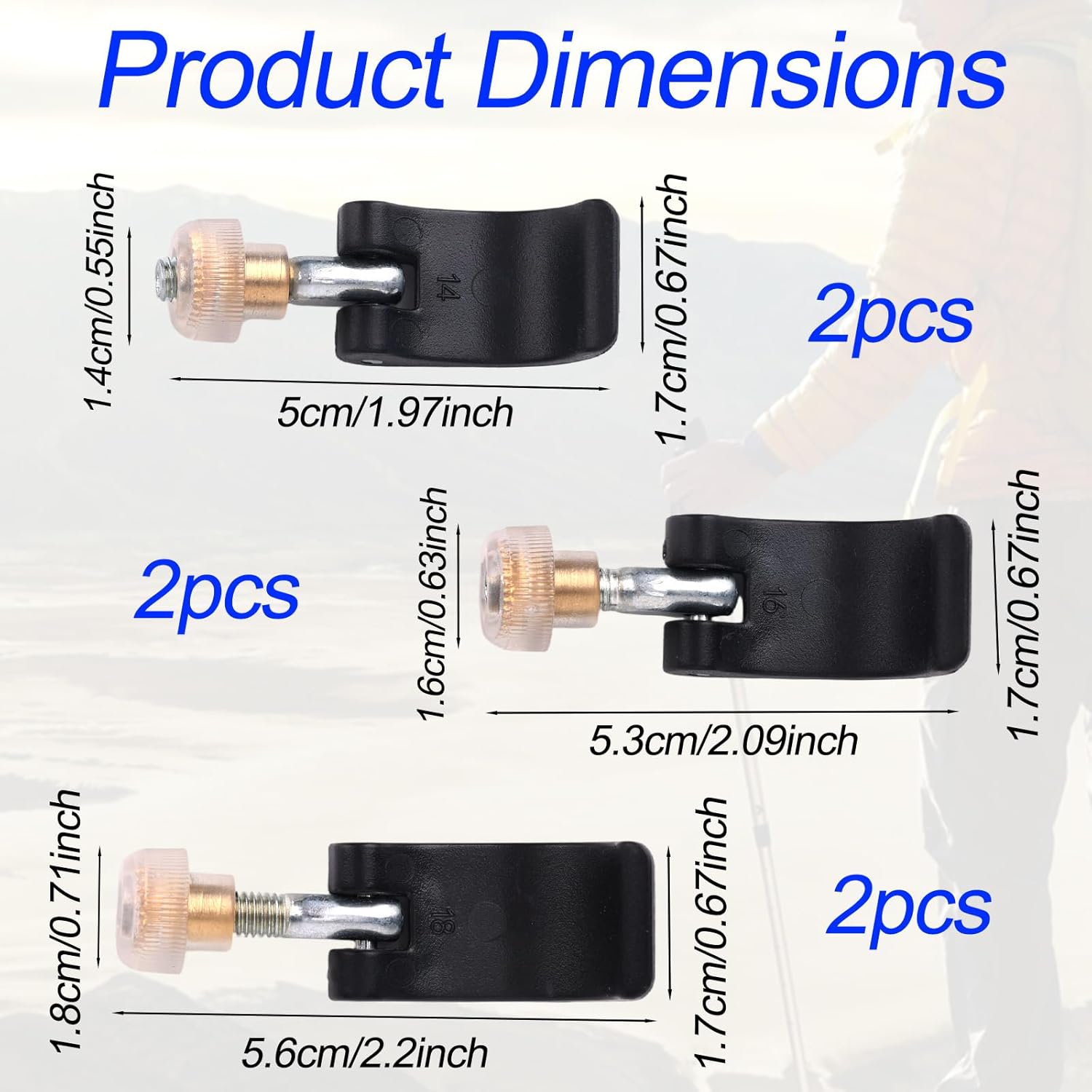 2 x 14mm/0.55in trekking pole replacement clips, 2 x 16mm/0.63in trekking pole replacement clips, 2 x 18mm/0.71in trekking pole replacement clips