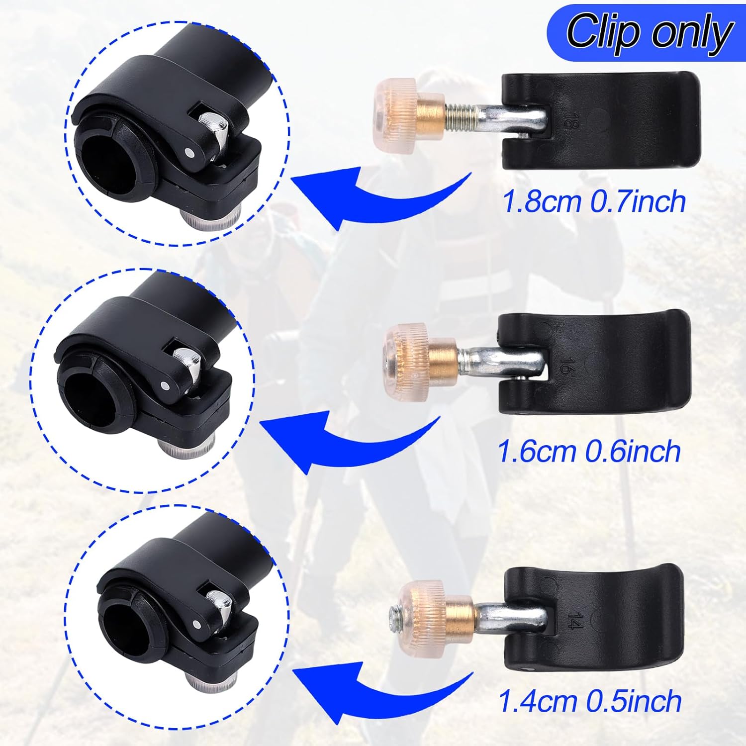 Wide Application: The trekking pole clips include 14mm/0.55in, 16mm/0.63in, and 18mm/0.71in diameter trekking pole clamps to accommodate poles of varying diameters. Whether you’re hiking, camping, or mountaineering, this accessory set can perfectly solve maintenance headaches.
