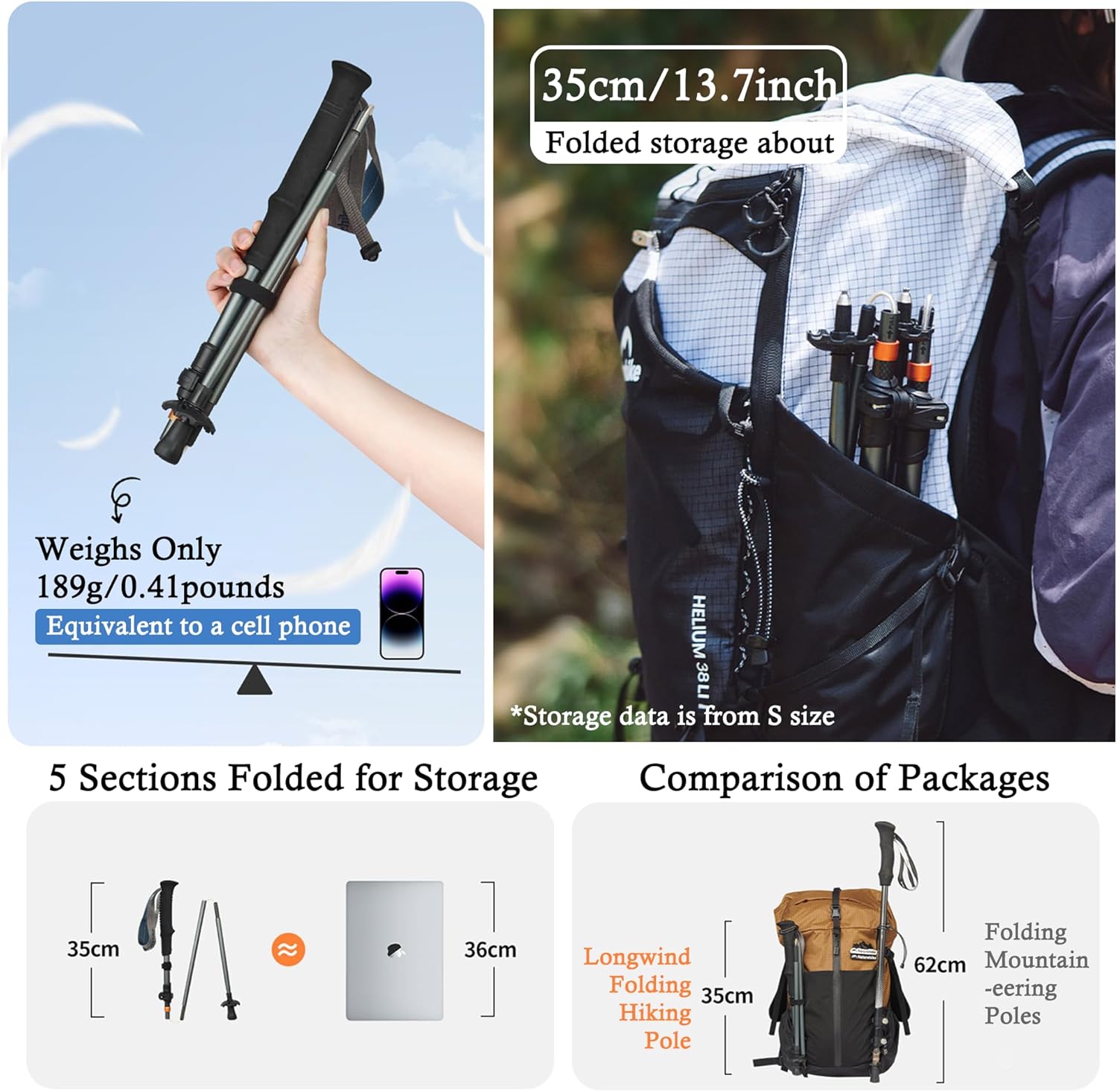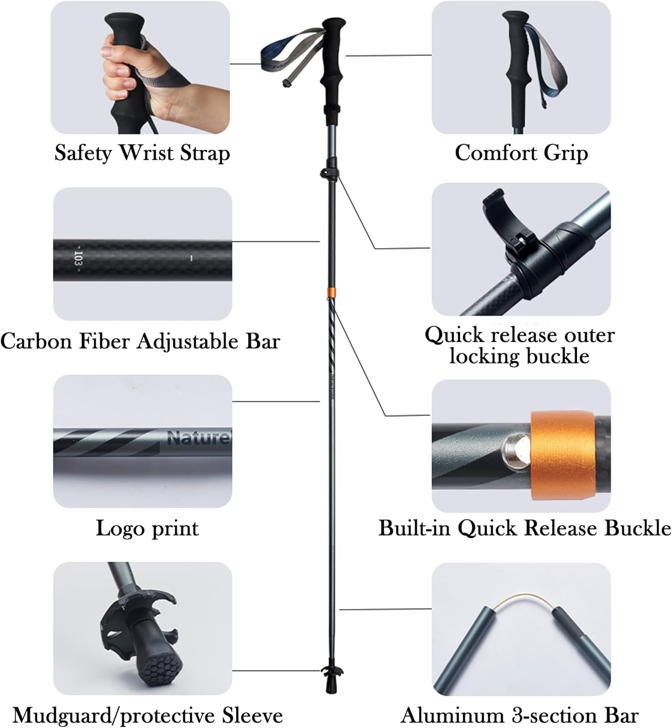 👍【Tri-fold Design & Ultra Lightweight】 -(* 1 pcs) Naturehike UL 3K Carbon Fiber Trekking Pole provids foldable tri-fold design. Storage size only 35cm/13.7inch (S size), 36cm/14.1inch (L size), and the net weight only 189g/0.41lb (S size), 221g/0.48lb (L size), so that to store in your backpack, luggage, or duffel bags.