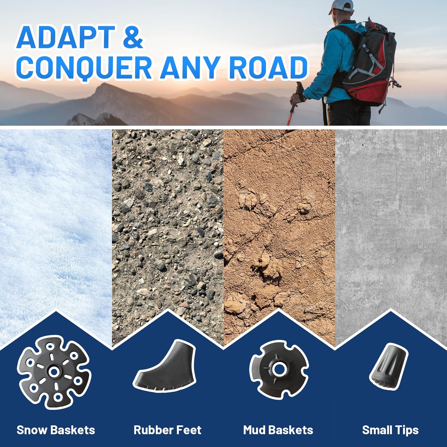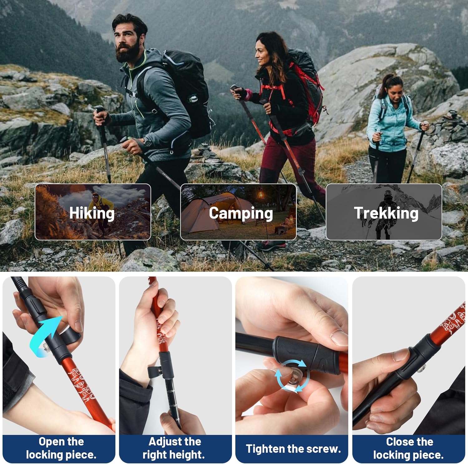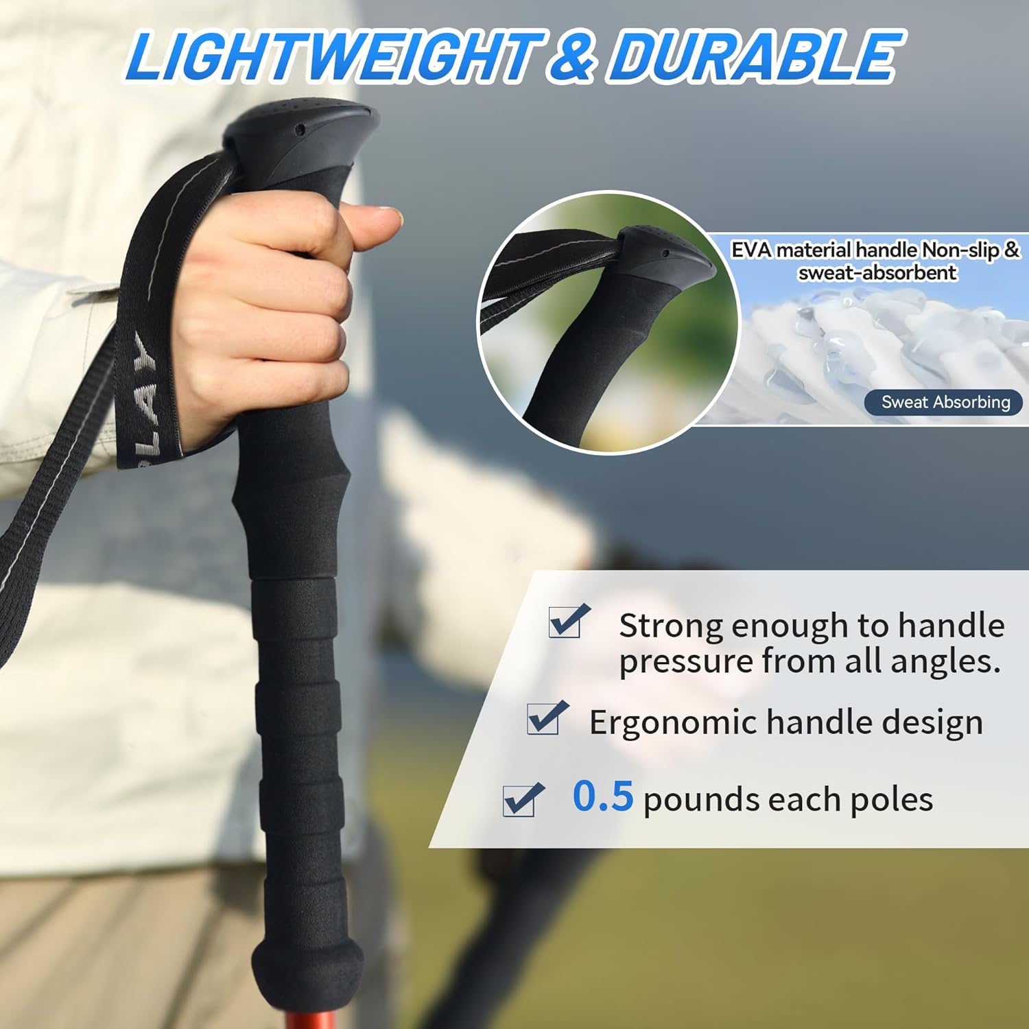 【lightweight】Our trekking poles are lightweight weighing only 220 grams (equivalent to 0.5 lbs). Despite the lightweight design, the poles also maintain a sturdy construction. These poles feel almost weightless in your hands, giving you more flexibility and comfort when traversing a variety of terrains, allowing you to experience fatigue-free hiking.