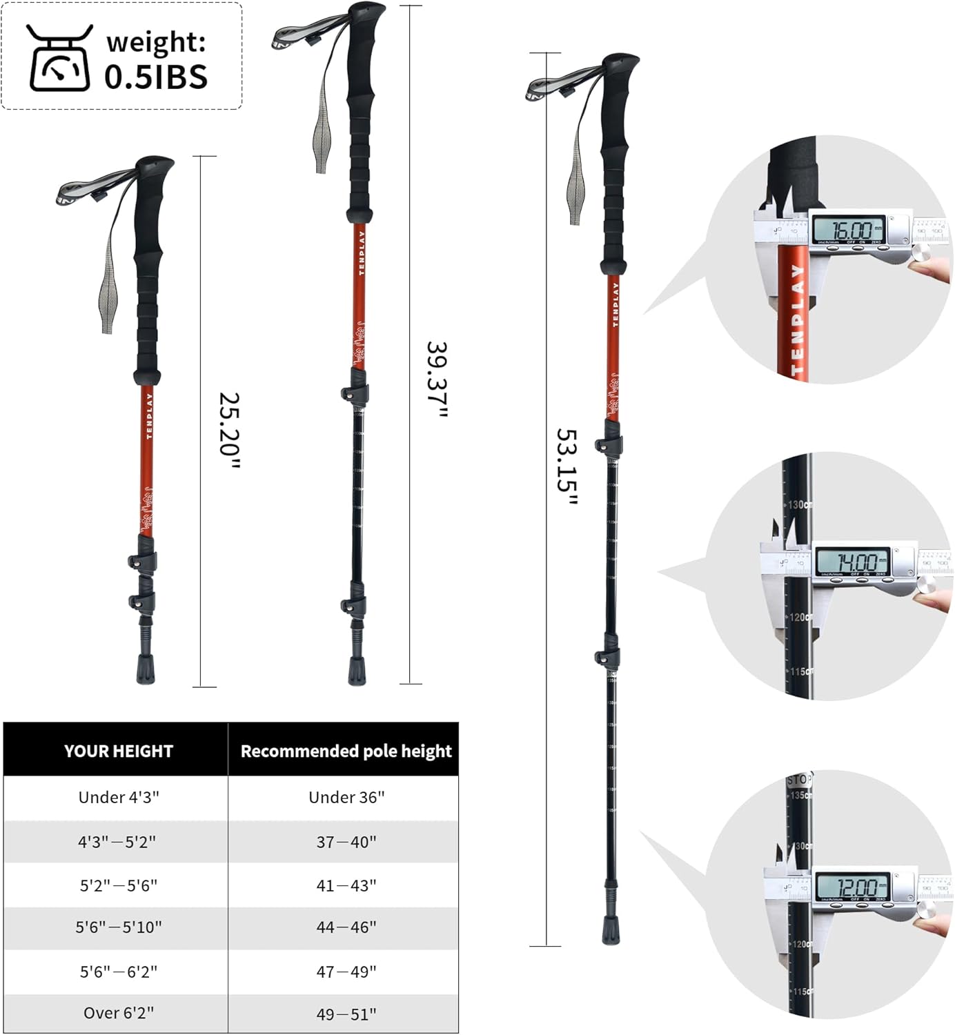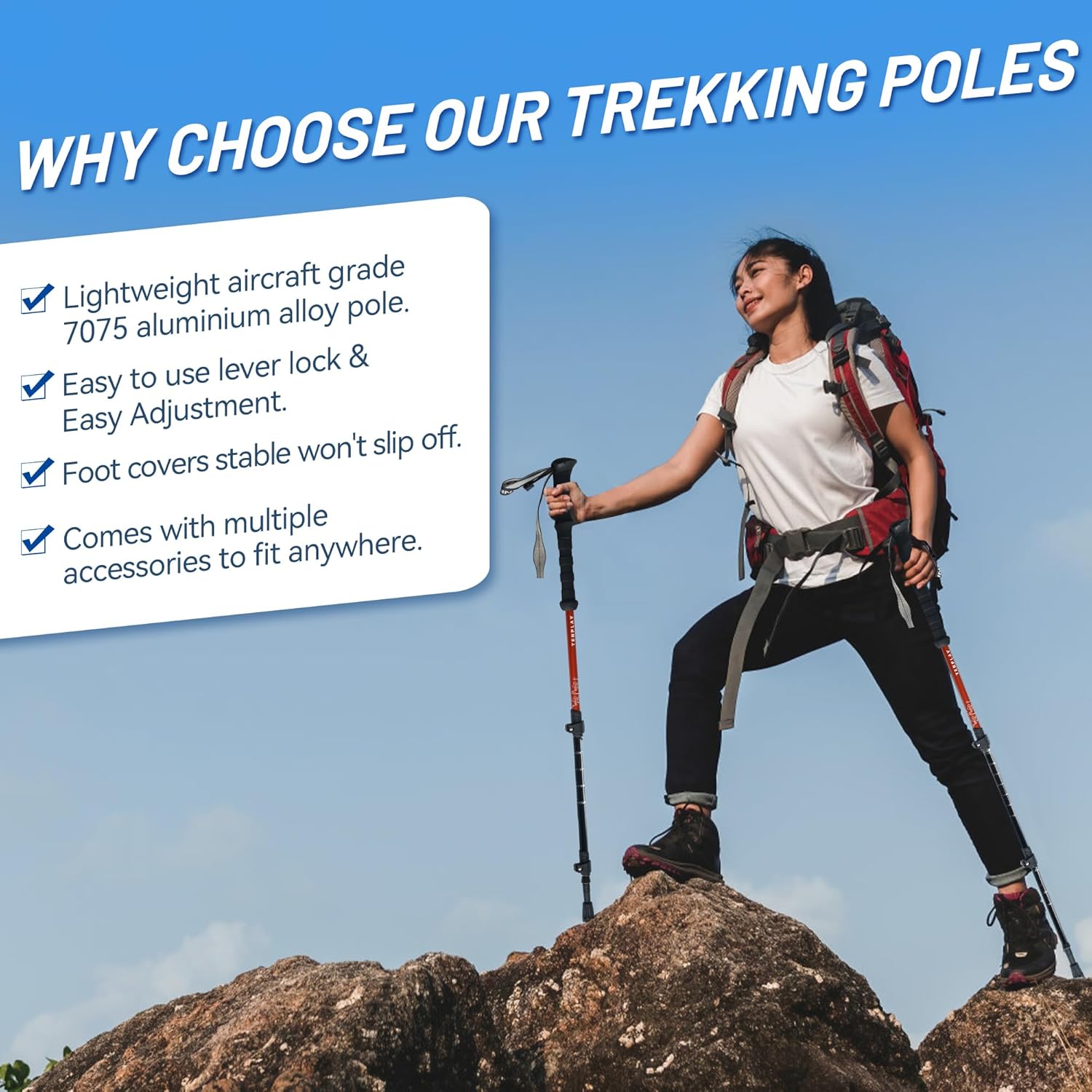 【Durable & Non-slip Material】 We use 7075 aluminium .These poles are made from lightweight 7075 grade aluminium to ensure weight savings when hiking and climbing.EVA non-slip handle conforms to the shape of your hand and stays firmly in place when in use.