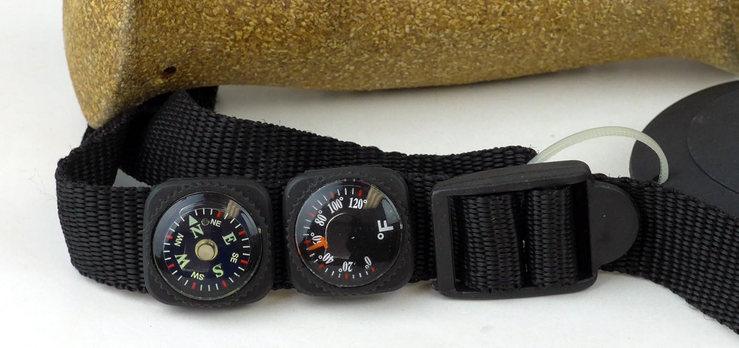 At the bottom end of the stick, a carbide tip hidden inside the rubber end cap. A snow disc is included for use on loose top soil or muddy road. Include a liquid filled mini compass and a thermometer.
