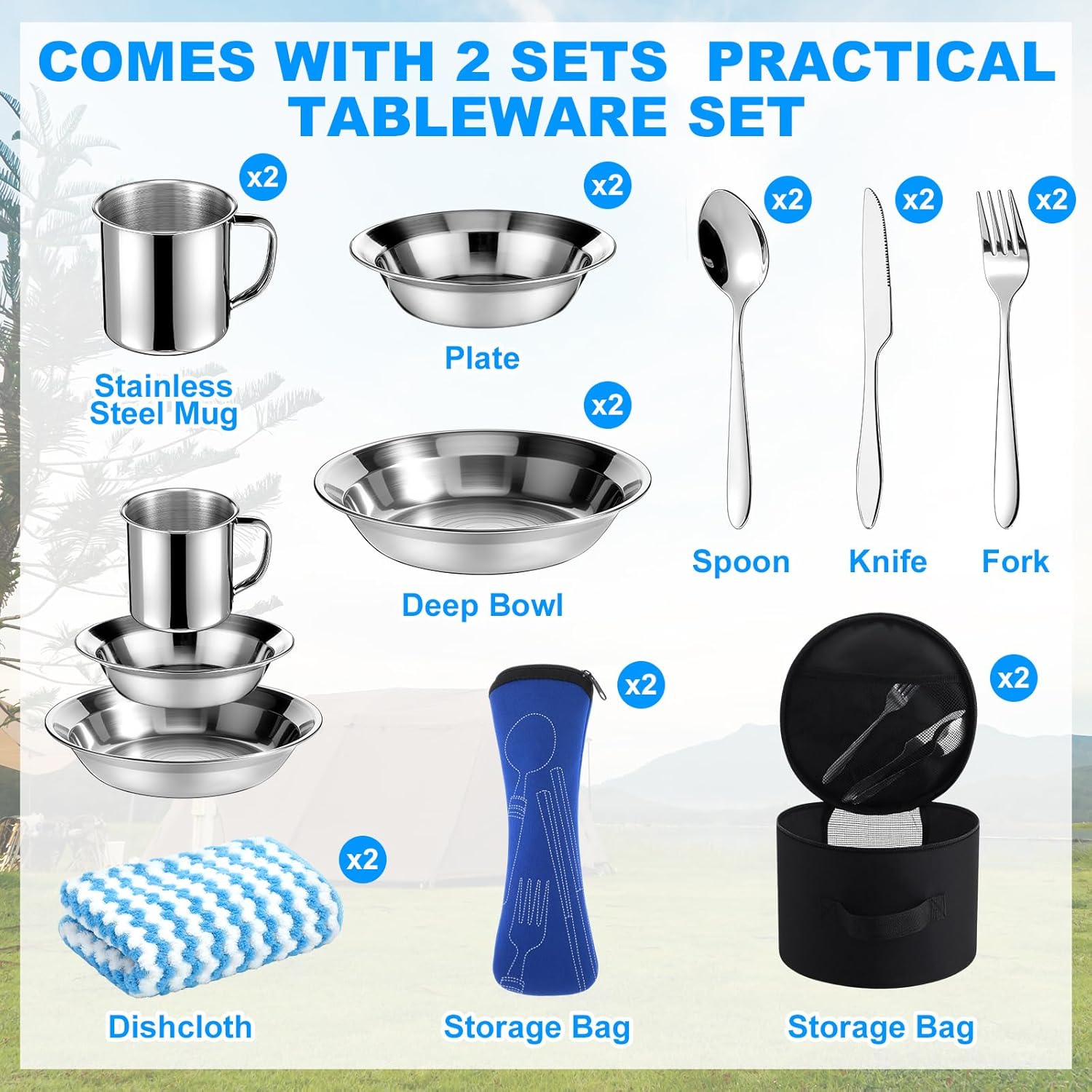 Stainless Steel Mess Kit for Easy Meal: the stainless steel mug and deep bowls are rust-resistant and easy to clean; Combined with a compact cutlery set (spoon, fork, knife) stored in a travel pouch, this mess kit is ideal for camp cooking, picnics, and RV travel