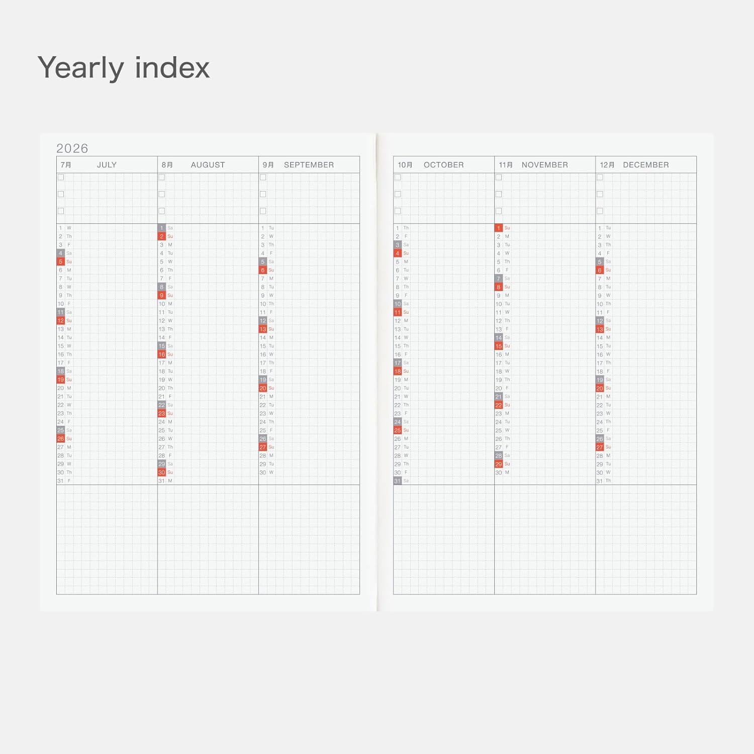 Each 2-page spread contains 6 months, with a total of 12 months in the yearly index. The top of each monthly column includes 3 checkboxes.