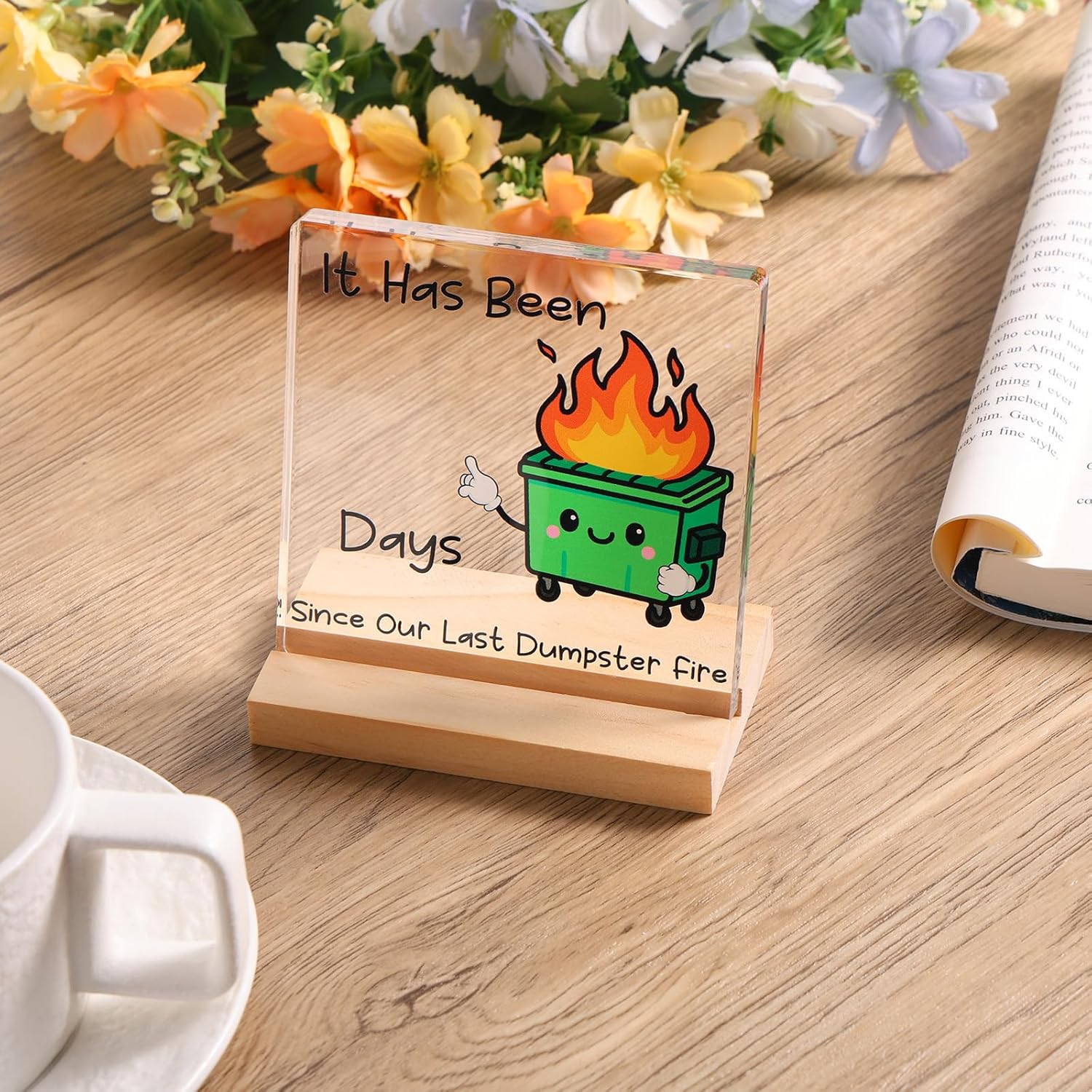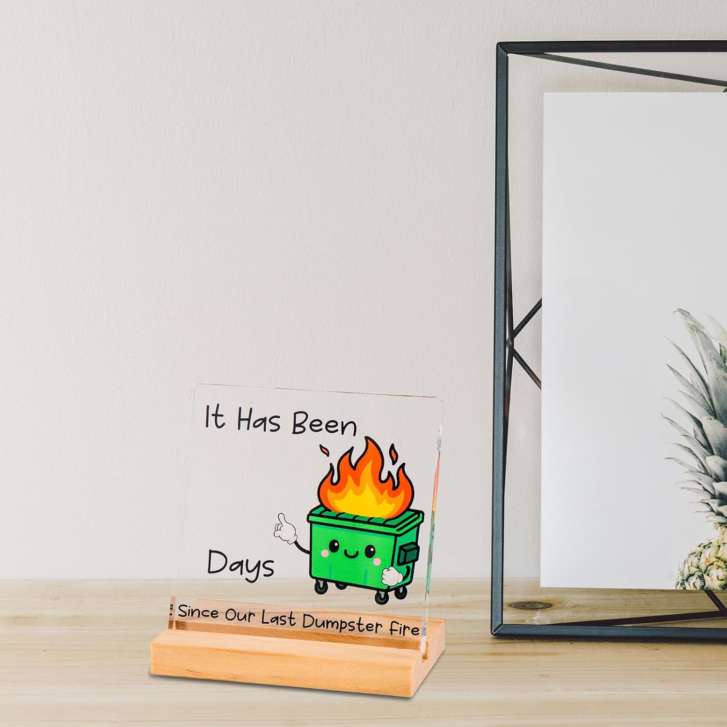 Humorous Office Decor: Features “It Has Been Days Since Our Last…” with a vibrant dumpster fire illustration, adding workplace humor to any office environment.
