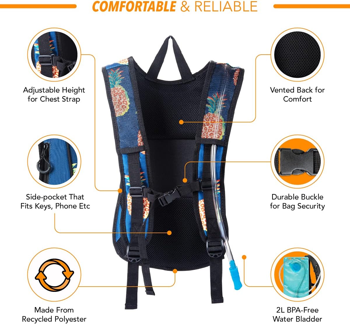 STAY LEAK-FREE: Our Hydration Pack’s EVA 2L (0.5 Gallon) water bladder ensures reliability during outdoor excursions, from running marathons to music festivals. Lightweight and UV-resistant, it’s the perfect companion for adventurers seeking convenience and peace of mind, ensuring you’re equipped with the right waterbag for your outdoor adventures.