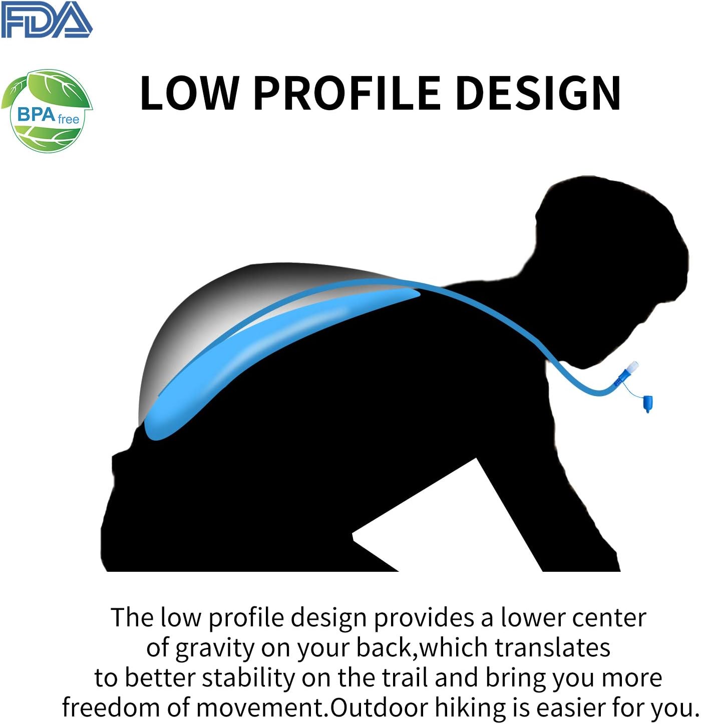 ARTIFICIAL MECHANICS DESIGN & LOW PROFILE DESIGN: The handle at the opening of the water bag adopts an ergonomic design for a comfortable grip. The threaded cleaning cover makes the opening and closing of the water bag more convenient and easy. It adopts a special patented design of 130° water soft mouthpiece, making it easier to drink outdoors. The pushable switch structure at the mouthpiece makes it easier to operate with one hand. Low Profile Design fit for unmatched stability