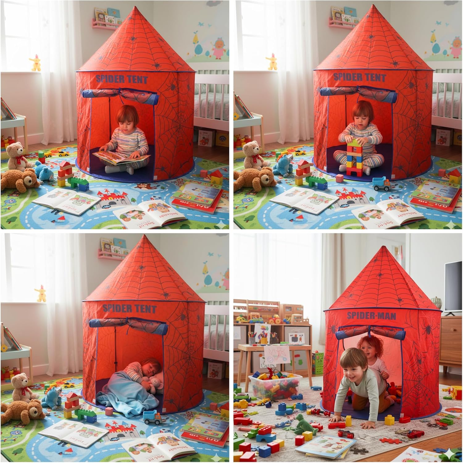 Designed with vibrant spider-web prints and bold “SPIDER TENT” detailing, this tent transforms any space into a crime-fighting headquarters or a secret superhero lair.