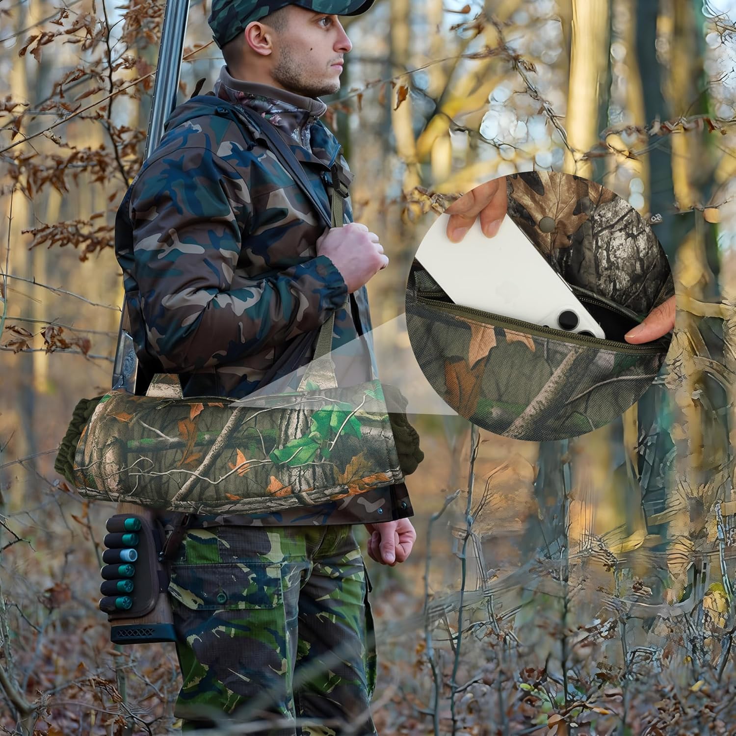 Convenient hunting gear design: this insulated camo hand warmer pouch features an adjustable shoulder strap for secure neck or waist carry, with a front zipper pocket that safely stores small hunting essentials for quick access, keeping your hands free to stay mobile and warm.