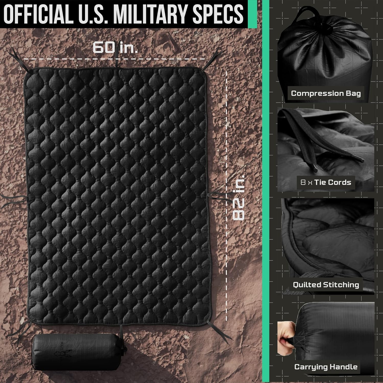 CRAFTED TO WITHSTAND THE TEST OF TIME: Durable & lightweight woven nylon fabric with quick-dry polyester batting. Reinforced with wave-patterned insulating camping quilt to keep you dry and warm, preventing sweat condensation. Features 8 pairs of tie cords around the edge with reinforced stitching for full compatibility with the poncho. OFFICIAL SIZE: This Poncho Liner is 62x82in and weighs 1.75 lbs including the military style compression sack to maximize your space capacity.
