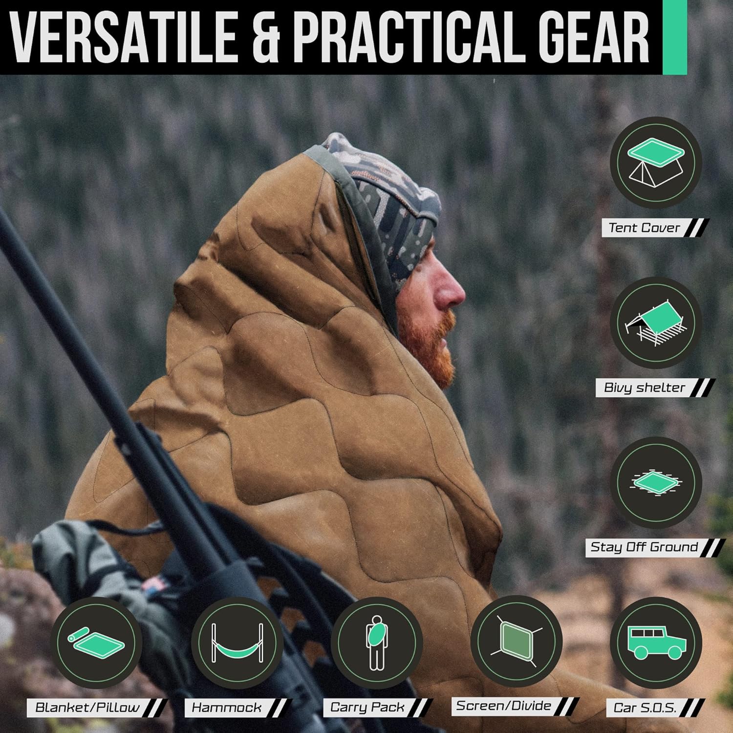 DESIGNED FOR VERSATILITY: Use it as a quick-dry beach blanket, stadium blanket, survival shelter, sun canopy, hammock insulator, pillow, tent divider, privacy screen, emergency gear, seat cover, disaster relief, concealment blind, carry satchel, backpacking blanket, sleeping bag or tent insulator, and much more. Pair it with Rain Poncho for a complete set.